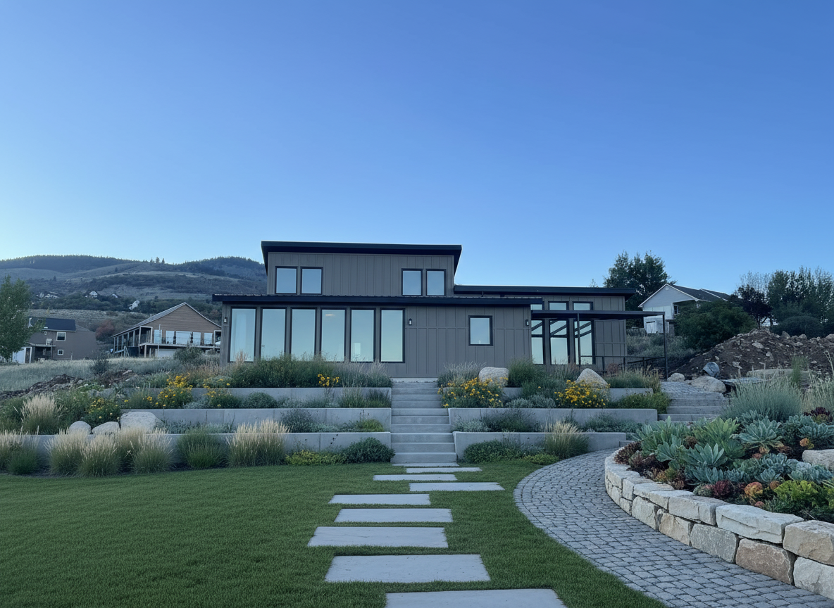 warm light grey siding with accent walls of vertical siding black roof sloping landscaping craftsman mountain style