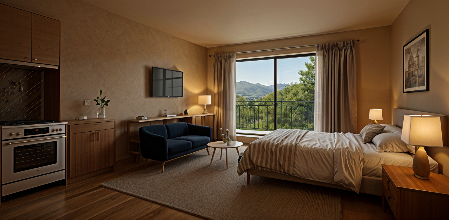 master bed room taupe color with indirect lighting in the ceiling without wooden back wall and closet closet only at the left hand side with light color wooden doors and some with crystal doors and indirect lighting on the shoese