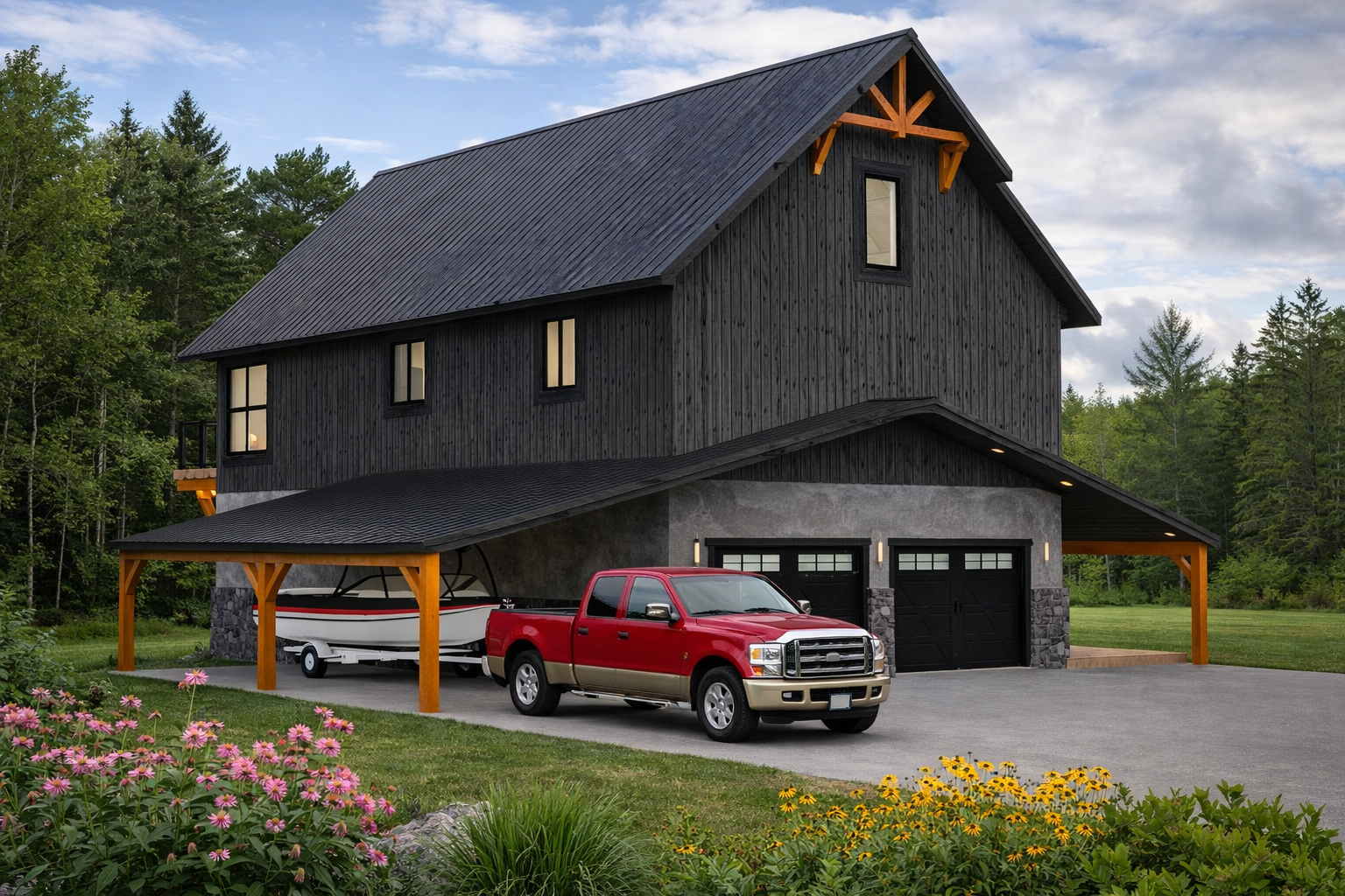 make this render look realistic house has steel roof and black exterior its bright daytime render