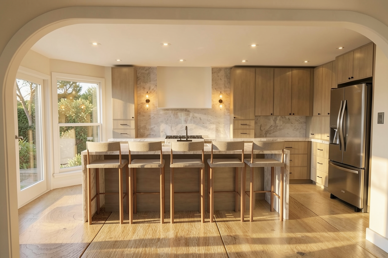use the uploaded sketchup view as strict geometry reference create a photorealistic render based exactly on the provided office image preserve the exact architecture ceiling shape wall paneling cabinetry desk meeting table shelving chairs windows proportions materials colors tones and textures do not redesign or replace anything keep the same warm wood finishes cream shelves gray ceiling white walls and the same burgundy wine red carpet this is a pastor s office for a pentecostal church used for sermon preparation ertc study pastoral counseling and leadership meetings add warm 3000k layered lighting continuous led cove lighting inside all recessed ceiling soffits all recessed ceiling spotlights turned on subtle hidden led backlighting behind the wall panels and cabinetry and integrated led strips inside the bookshelves make all lighting clearly visible warm elegant premium and realistic add one pastor seated at the desk and 2 3 people in a natural office meeting they should look realistic professional calm and engaged in discussion add realistic office styling papers folders notebooks pens discussion materials on the desk and meeting table plus a bible or leadership book on the main desk style the shelves naturally theology books bibles leadership books tasteful decorative objects framed pieces vases and soft shelf lighting elegant refined not overcrowded keep the same camera angle and composition final style ultra photorealistic premium interior render warm pastoral executive office soft realistic shadows accurate wood textures realistic carpet texture elegant and welcoming atmosphere high end architectural visualization clean but lived in do not change the layout furniture design wall finishes shelving design carpet color color palette material tones or camera composition do not add windows do not remove cabinetry do not modernize beyond the original design