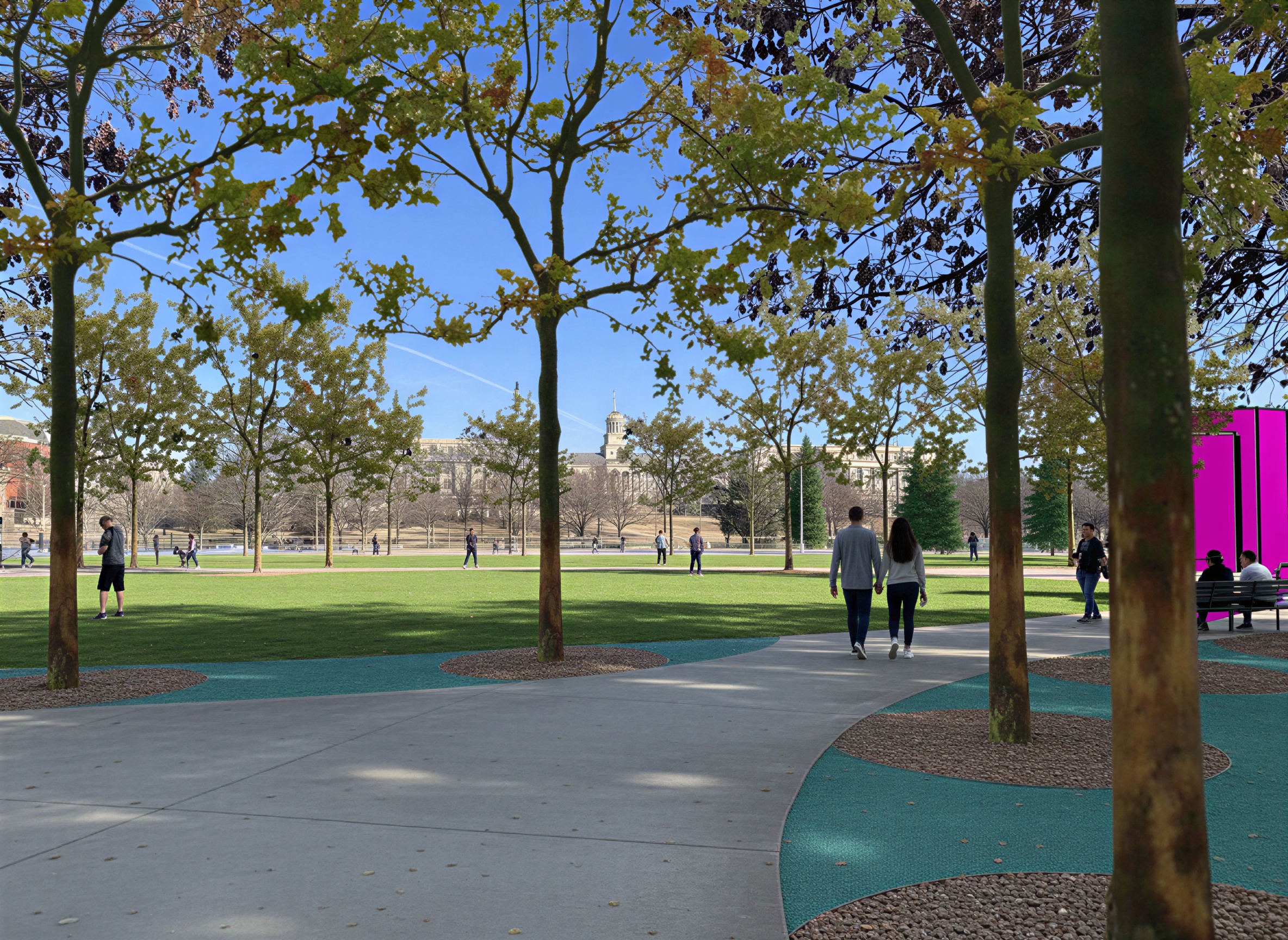 add danish modern yellow picnic tables under trees in foreground with people eating on them