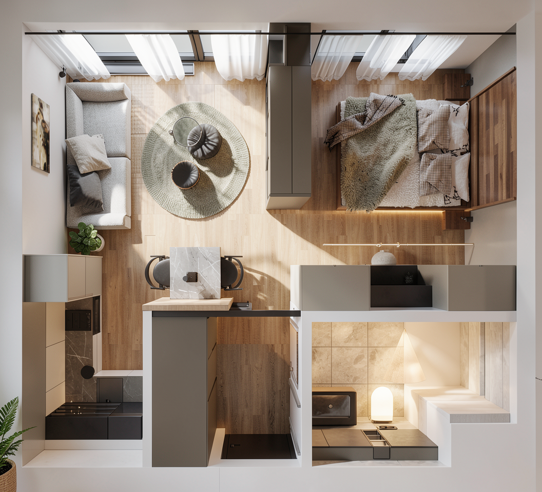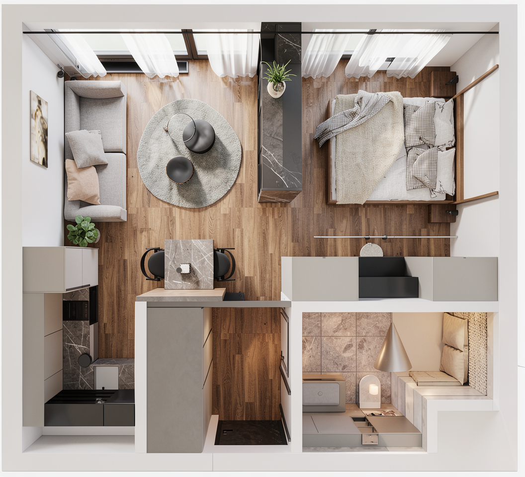 blackbutt tabletop with beige leather chairs around it dashed black lines remain