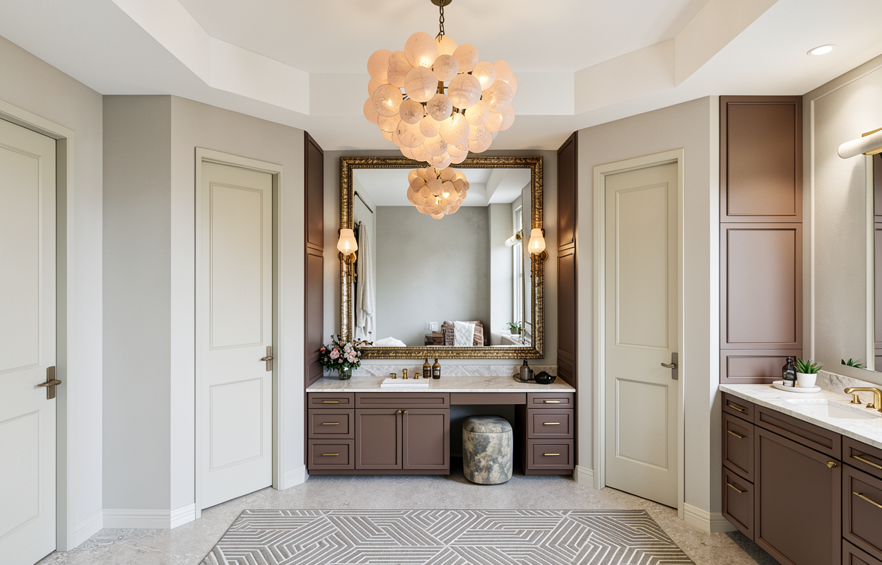camera di hotel con armadio in rovere naturale fondo nicchia frigobar in specchio ambrato mensola in ottone e punto luce centrale incassato piano frigobar in marmo travertino con bordo in ottone a sinistra tavolino con piano in travertino e bordo in ottone strip led nella veletta della tenda con luce calda verso il basso a parete abbiamo una carta da parati chiara con leggerissimo effetto tessuto fai entrare della luce naturale dalla finestra
