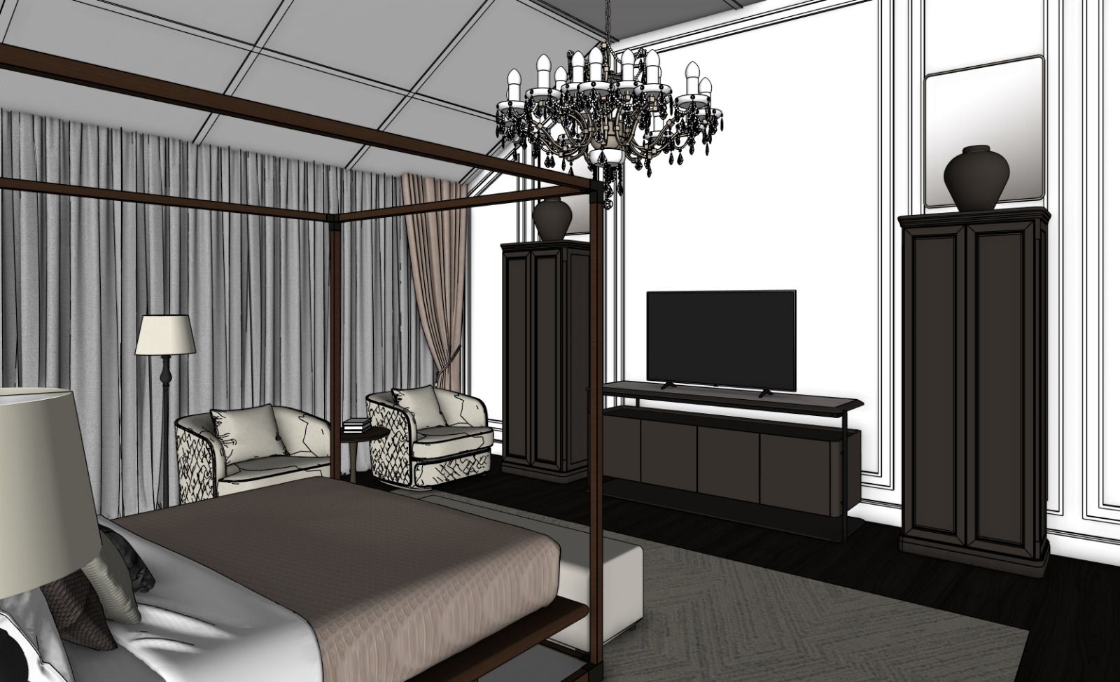 ceiling and ceiling structure in white both armchair in beige fabric finish flooring in dark wood close to black curtain sheer without light coming thru cabinet in brown plain color with grain texture only