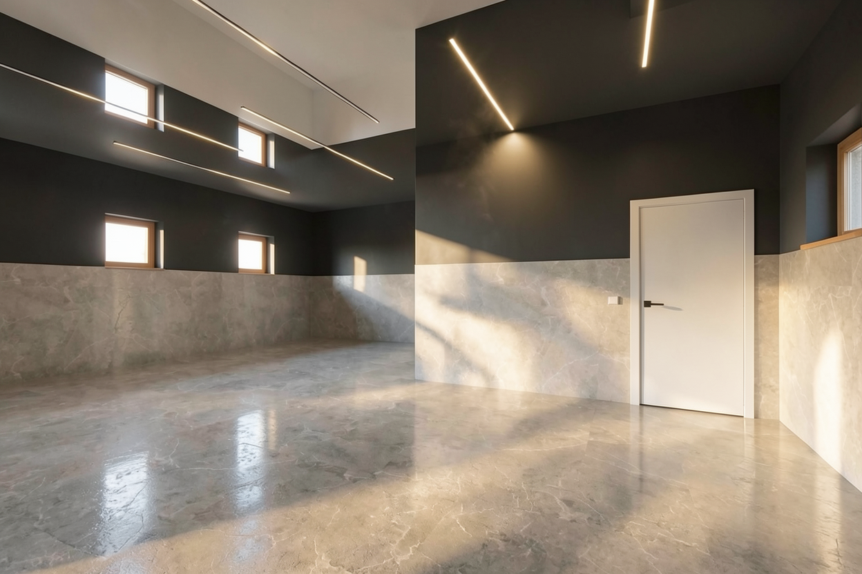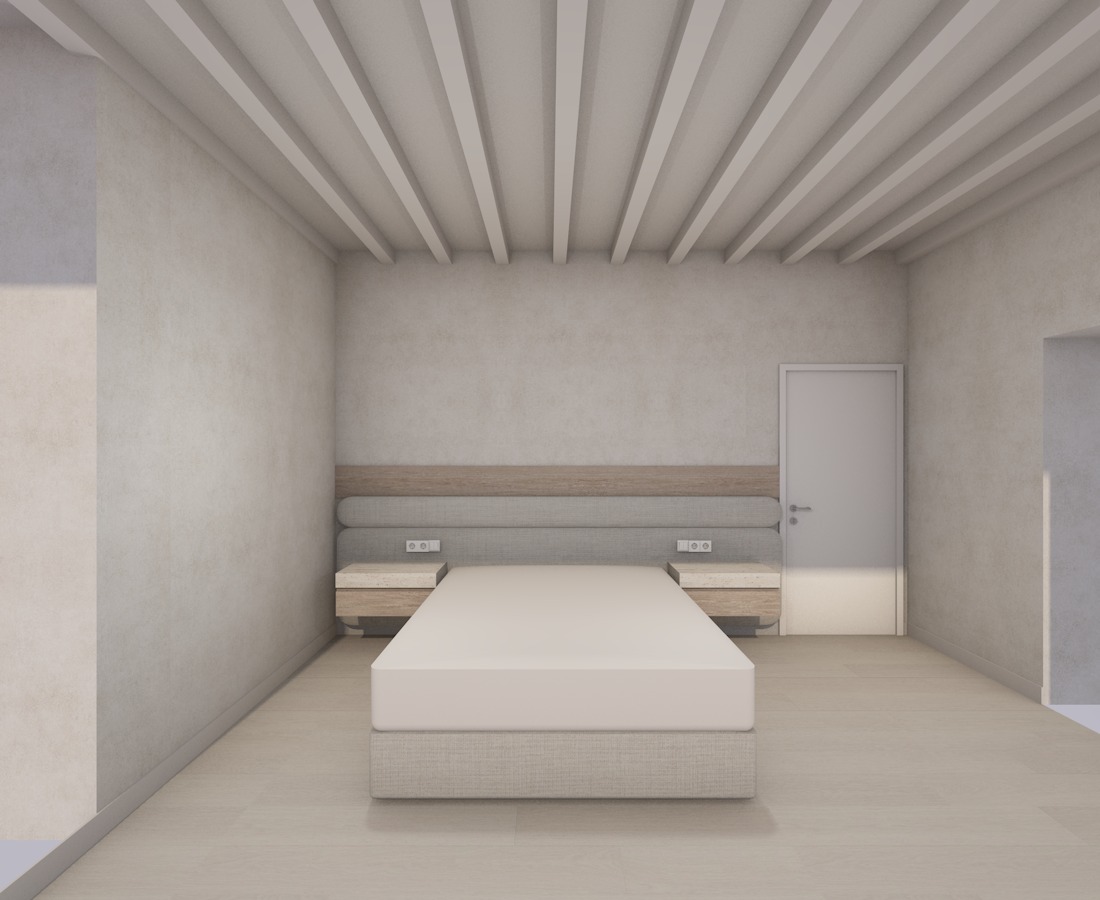 create a highly realistic render of a minimal bedroom with a calm and serene atmosphere the space feels soft warm and harmonious with a refined and natural aesthetic the bed is centered in the room featuring a fully upholstered base in a light beige fabric with a soft linen texture the headboard is designed as a layered composition it consists of two horizontal upholstered elements in soft beige tones with rounded edges creating a smooth and continuous form above them there is a slim horizontal light oak wood panel that runs across the wall adding a subtle contrast on both sides of the bed there are floating bedside tables with a minimal design they combine light wood elements with a stone surface on top maintaining a clean and balanced look the walls are finished in a light beige microcement creating a seamless and soft background the ceiling features exposed beams painted in an off white tone adding rhythm and architectural depth to the space on the right side there is a simple door in a light neutral color blending with the overall palette the flooring is in a light natural tone enhancing the calm and minimal atmosphere the space is illuminated softly with a diffused and even light creating minimal shadows and a peaceful ambiance ultra realistic render high resolution interior design magazine photography style ultra clear realistic textures