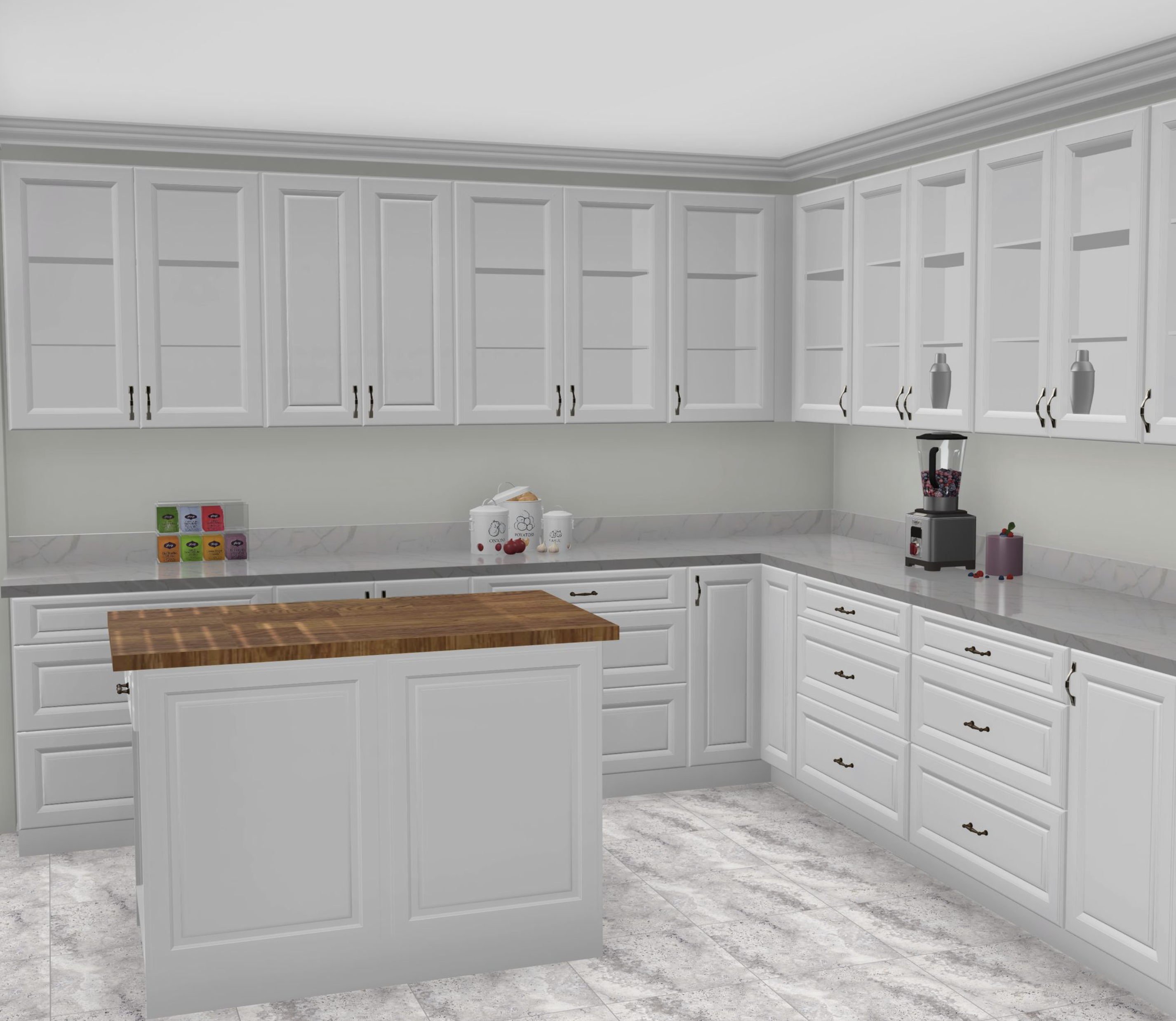 add a bowl of fruit on the island cabinets are connected to the ceiling with crown moulding