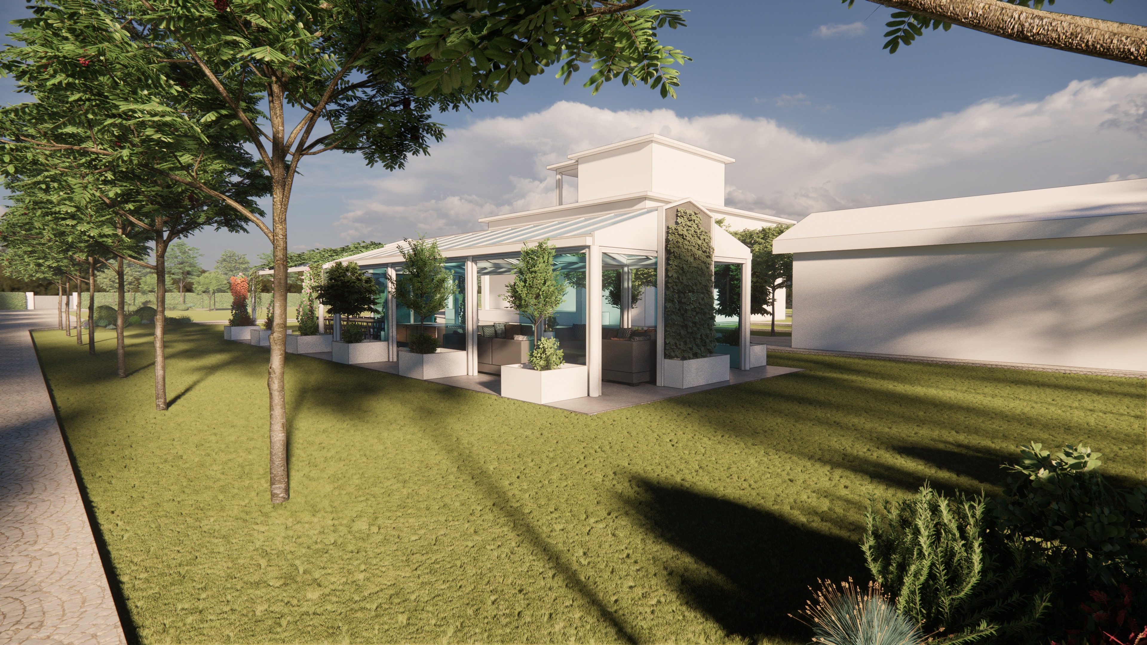 modern white steel and glass greenhouse under the roof ridge a technical roller blind system is installed and partially deployed for shading landscape background high quality textures and materials photorealistic