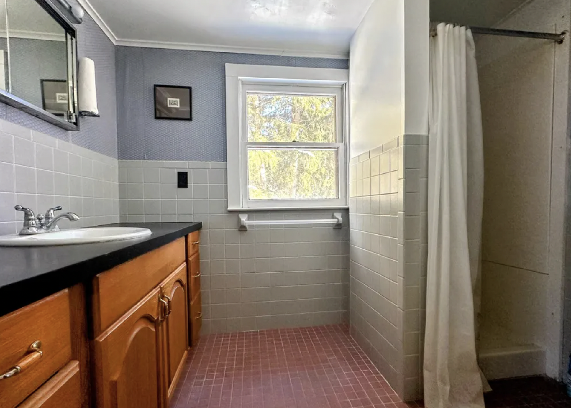 re tile the entire room in with dark green zia tiles make the vanity double sinks marble countertop and and simple shaker cabinets with round knobs make the wall seperating the shower a wall of glass blocks with the circle center and fully tile the shower in the same zia tile