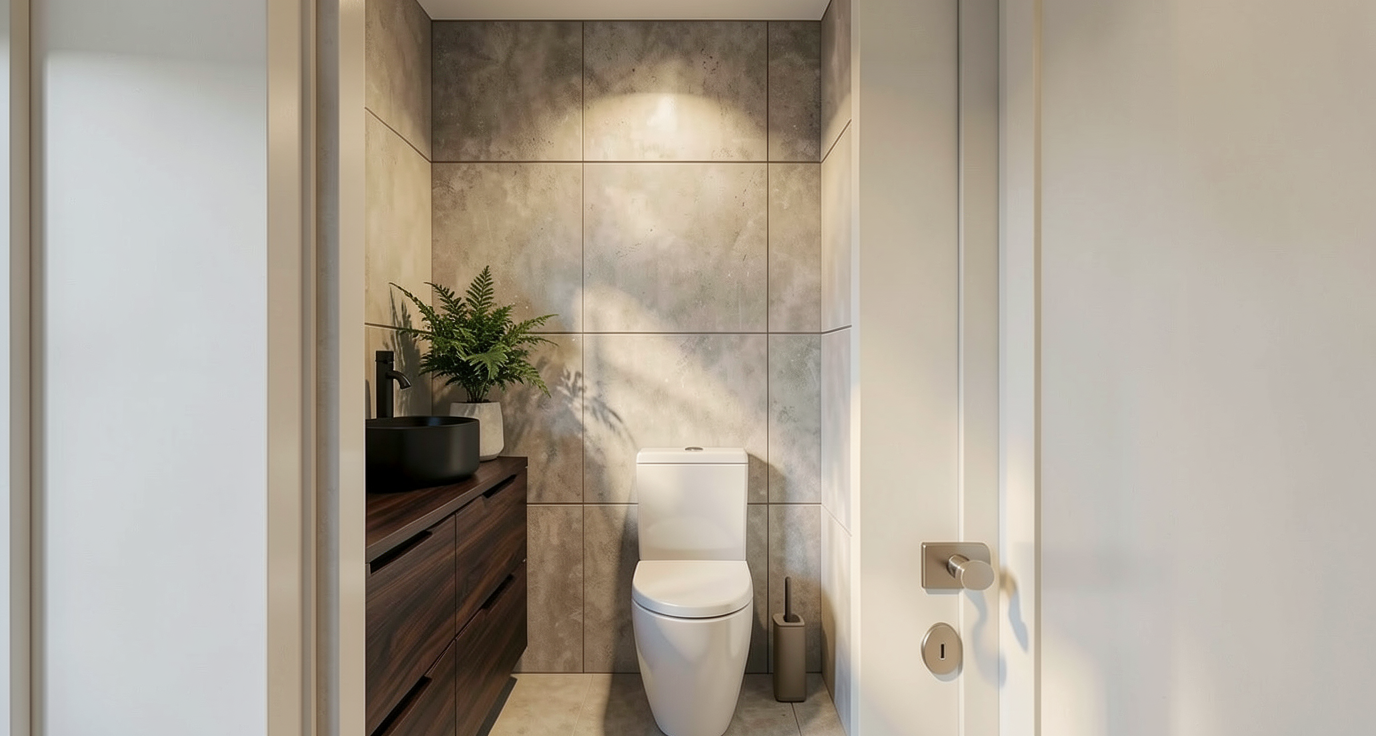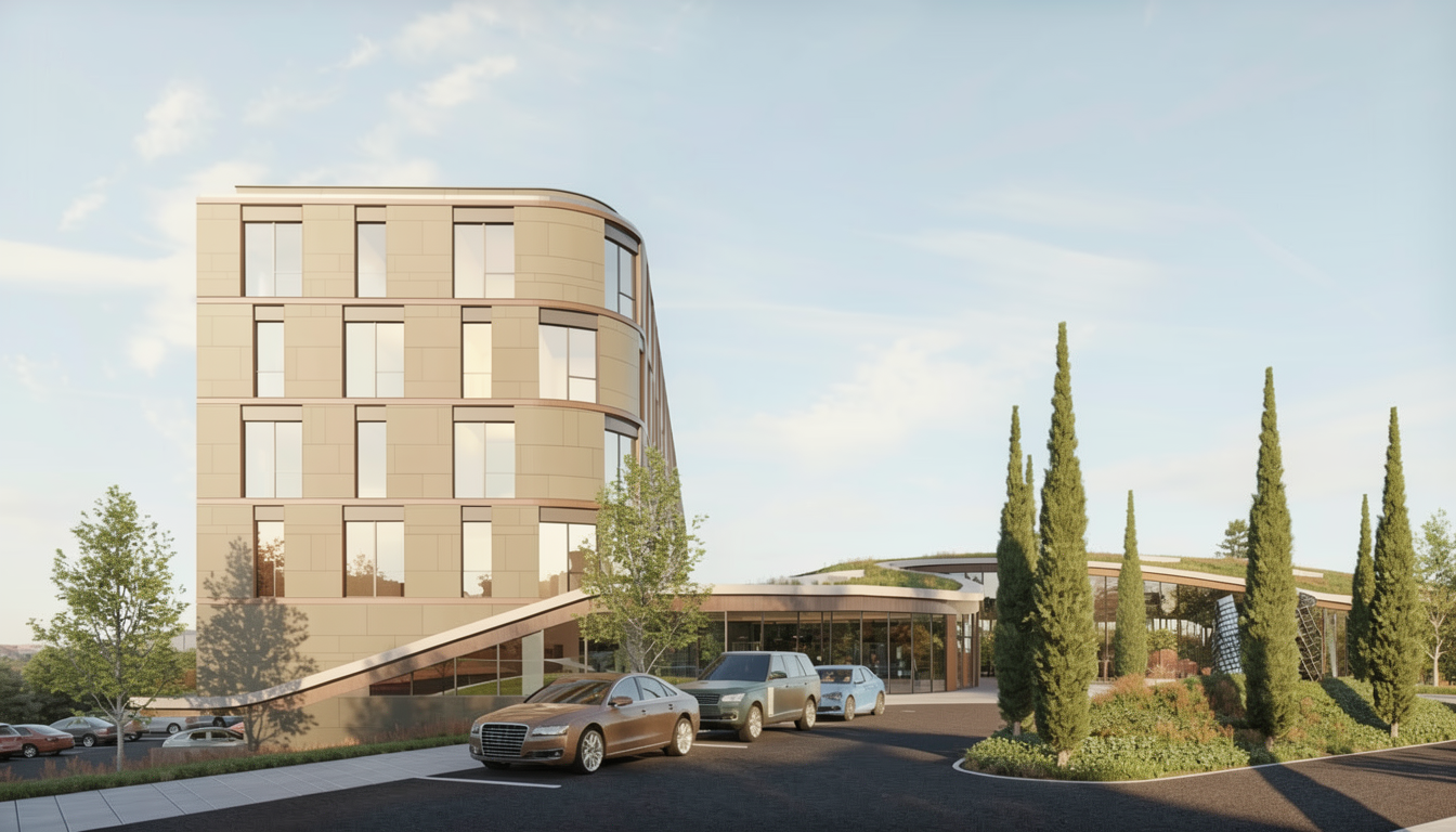 render a beautifully modern office dining area with large windows capturing natural light use a warm brown wood floor incorporate soft cream curtains flowing near the windows enhancing the light airy atmosphere the ceiling is an acoustical spray on ceiling beige