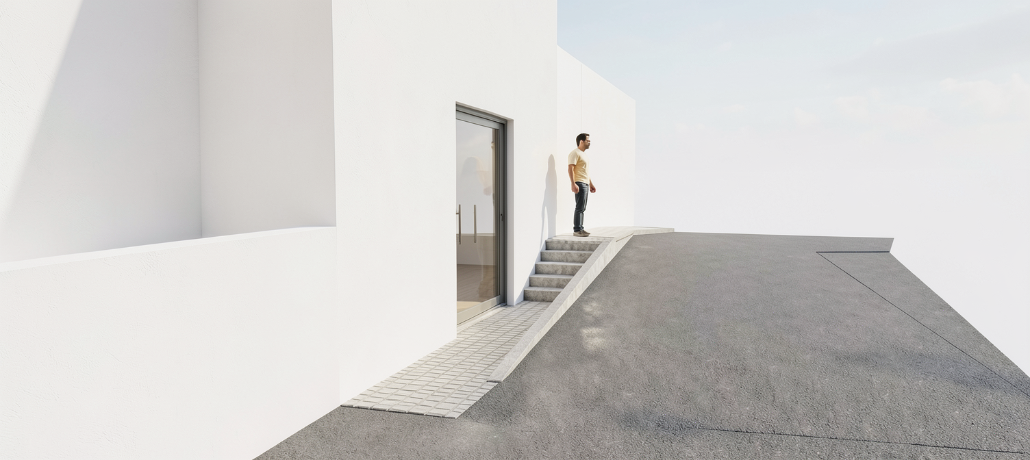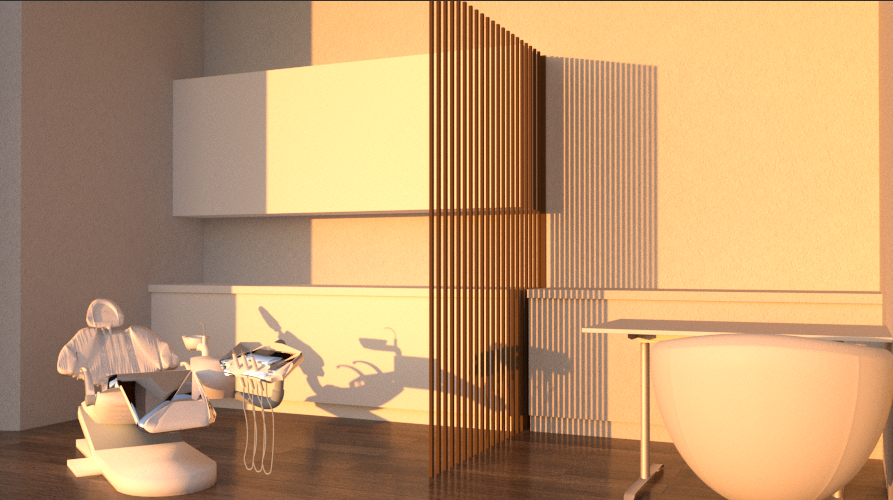 modern premium dental clinic interior minimalist warm aesthetic scandinavian influence biophilic design natural wood flooring white matte finishes light neutral tones warm professional atmosphere left side dental treatment area with dental chair white built in cabinets countertop integrated dental equipment overhead lamp no windows soft indirect lighting right side entrance reception area with modern desk and chairs white floating shelves behind desk decorative objects and plants organized laptop and clean look division both areas separated by a small decorative partition wall half wall modern design wood accent or textured finish allowing visual connection and light flow clean composition premium materials natural textures biophilic elements indoor plants calming healthcare atmosphere camera framing interior shot where the ceiling is not visible very high ceiling out of frame no ceiling design no beams no ceiling elements in render premium healthcare interior architectural interior design ultra realistic render cinematic lighting soft shadows realistic reflections high detail photorealistic wide angle interior shot interior architecture visualization professional 3d render quality