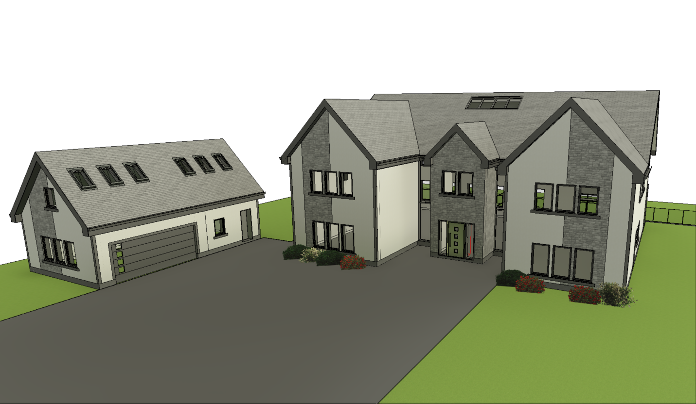 preserve the existing building geometry exactly as shown do not change or add any architectural elements to the house or garage drone height view matching the original angle warm summer evening just before sunset with golden hour lighting and soft natural shadows photorealistic materials and lighting physically accurate realistic textures subtle warm interior lights visible through the windows creating a gentle warm glow natural landscape enhancement only realistic grass driveway and rolling countryside in the distance looks like a real photograph no stylization 4k resolution