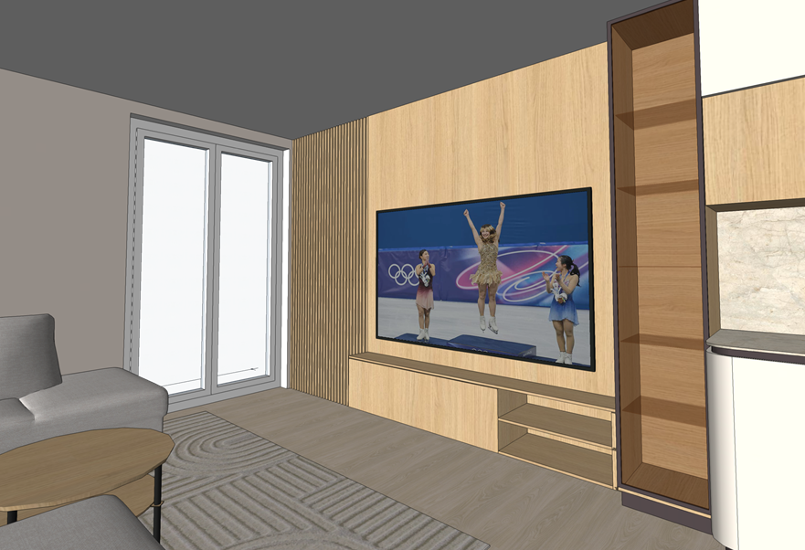 render a realistic interior visualization to the left of the television place vertical wooden slats to the right of the television add a display cabinet fill the cabinet with glassware and decorative vases install light sheer white curtains on the window outside the window trees should be visible use soft subtle lighting with limited direct sunlight creating a calm and natural atmosphere