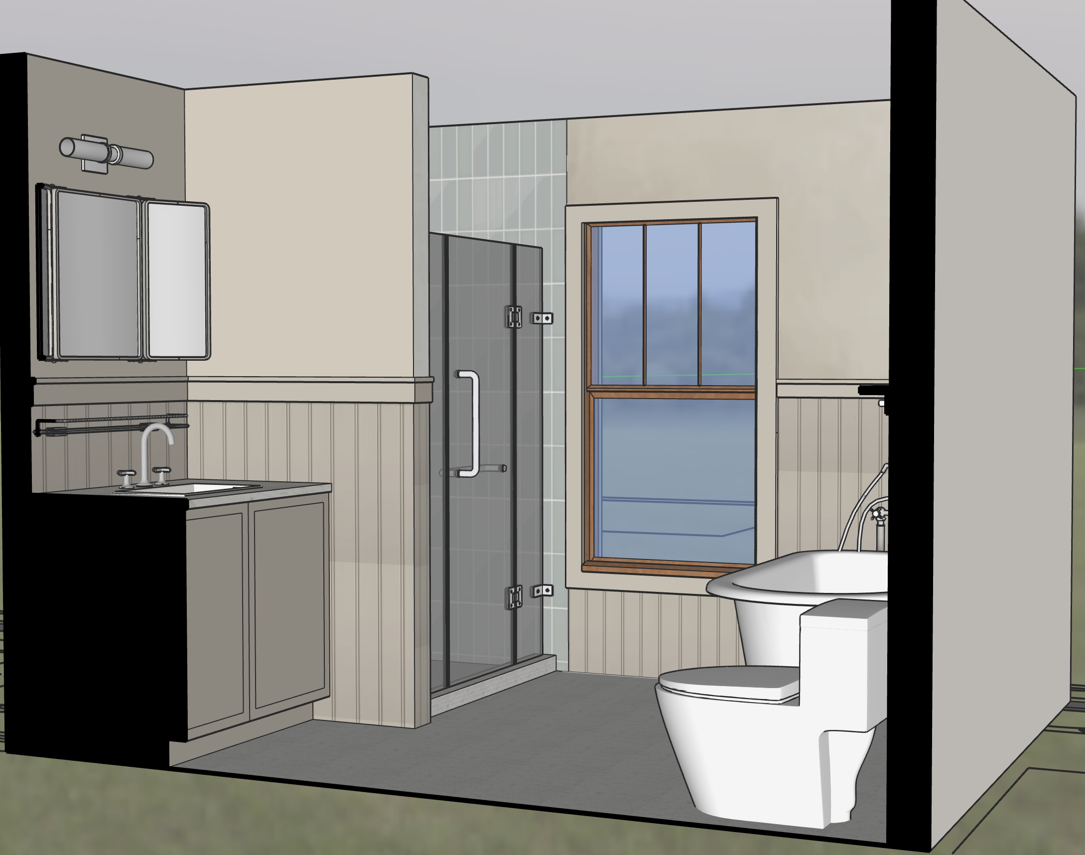 tiny carrara marble mosaic floors warm grey cabinet color warm grey color beadboard and window trim light blue 3x9 vertical stack shower tile warm grey lime wash upper walls