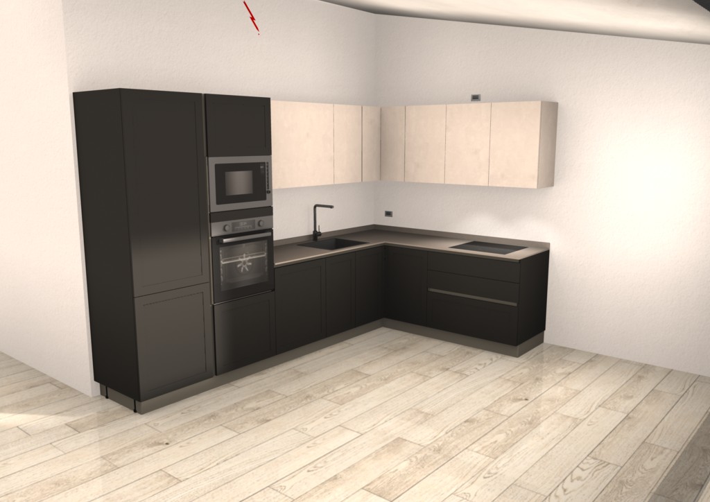 pensili effetto cemento spatolato chiaro pavimento legno molto chiaro quasi bianco top cucina ceramica grigio