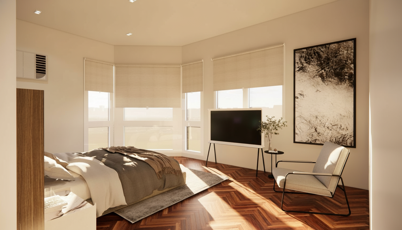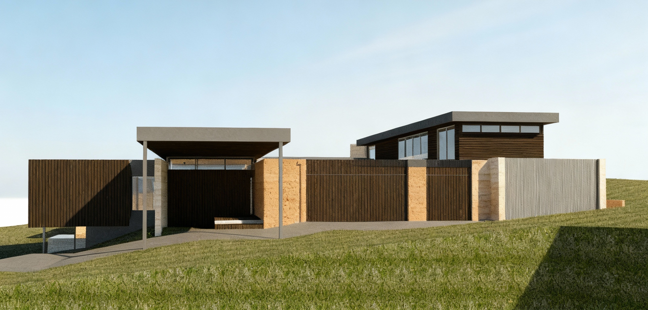 create a 2d render make the timber cladding black and add more landscaping left side of the building to be stone cladding