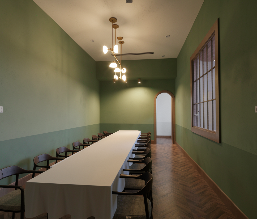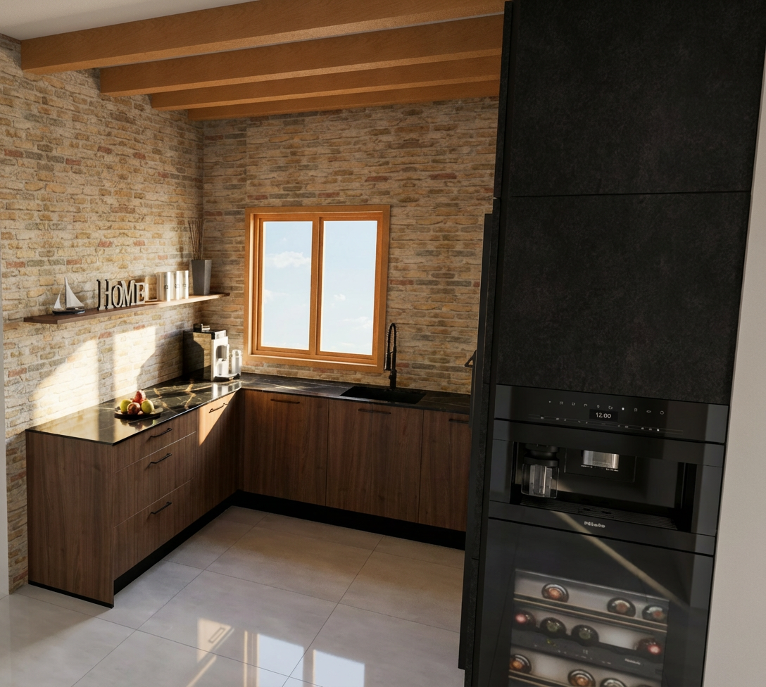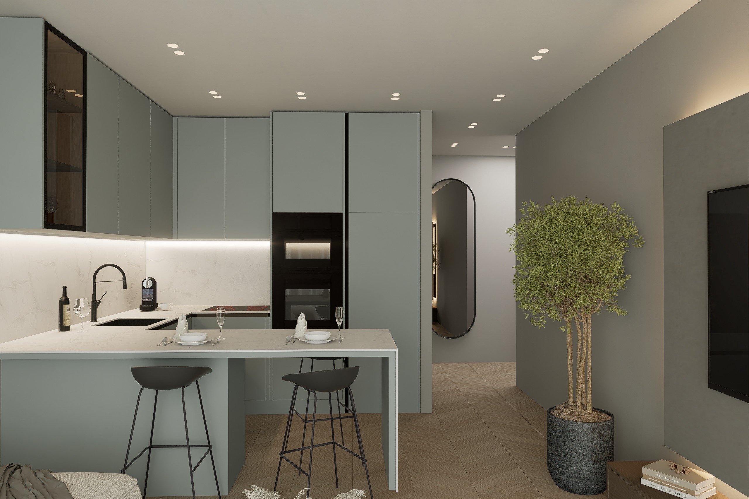 transform this kitchen render into an ultra realistic high end interior visualization while keeping the exact same layout proportions island design cabinetry configuration appliances lighting positions walls floor pattern and camera angle unchanged do not redesign anything apply a soft desaturated sage grey green tone to all main cabinetry surfaces matching the reference color exactly the finish should be matte lacquer smooth refined and uniform not glossy not textured keep the material palette minimal and premium cabinetry in sage grey green matte finish countertop and backsplash in light warm white stone subtle veining soft quartz look flooring in natural light oak wood warm tone matte finish realistic grain appliances in clean modern black glass faucet and sink in matte black or brushed dark metal enhance realism with soft reflections on matte lacquer surfaces subtle imperfections and depth in painted cabinetry realistic stone texture with fine veining natural wood grain variation on the floor accurate shadowing under cabinets and island soft ambient occlusion for depth lighting should be balanced warm neutral 3000k 3500k soft under cabinet led glow realistic ceiling spotlights with proper falloff overall clean calm architectural lighting no harsh contrast keep styling minimal and elegant no clutter just subtle table setup as shown render as a photorealistic architectural image ultra detailed soft natural light premium modern kitchen aesthetic