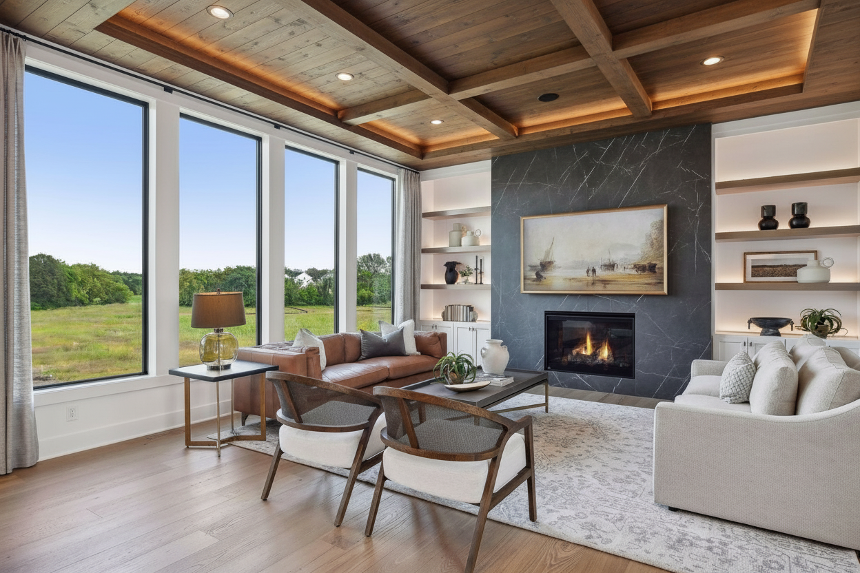 add grass and landscaping add leaves to winter trees in background