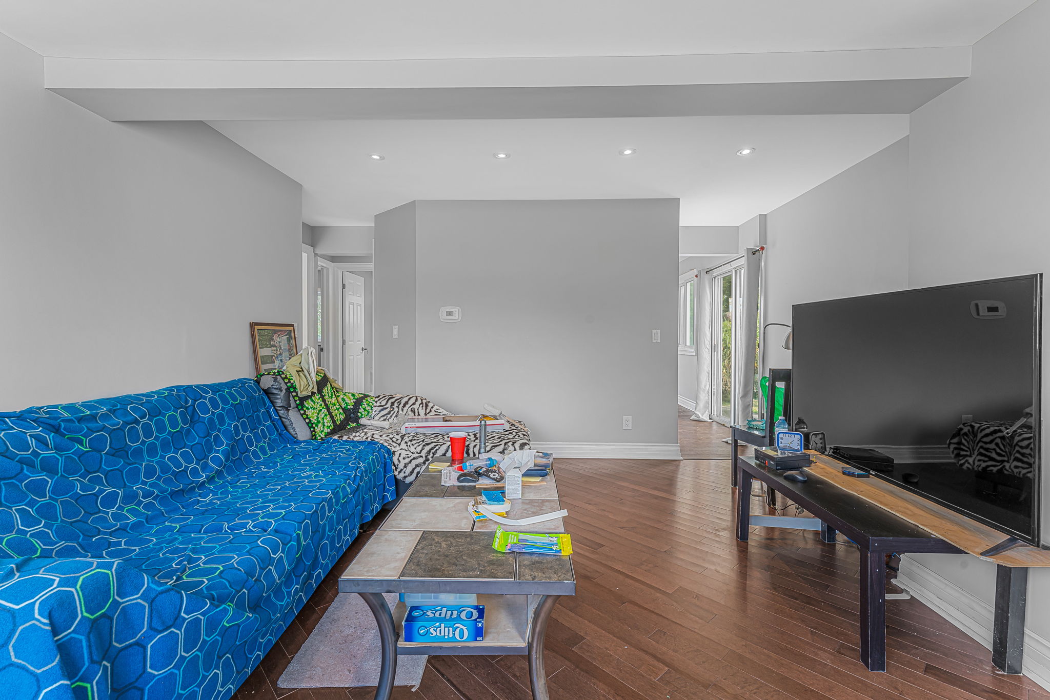remove tv and tv stand declutter and stage with grey couch and dark wood coffee table with flowers on it
