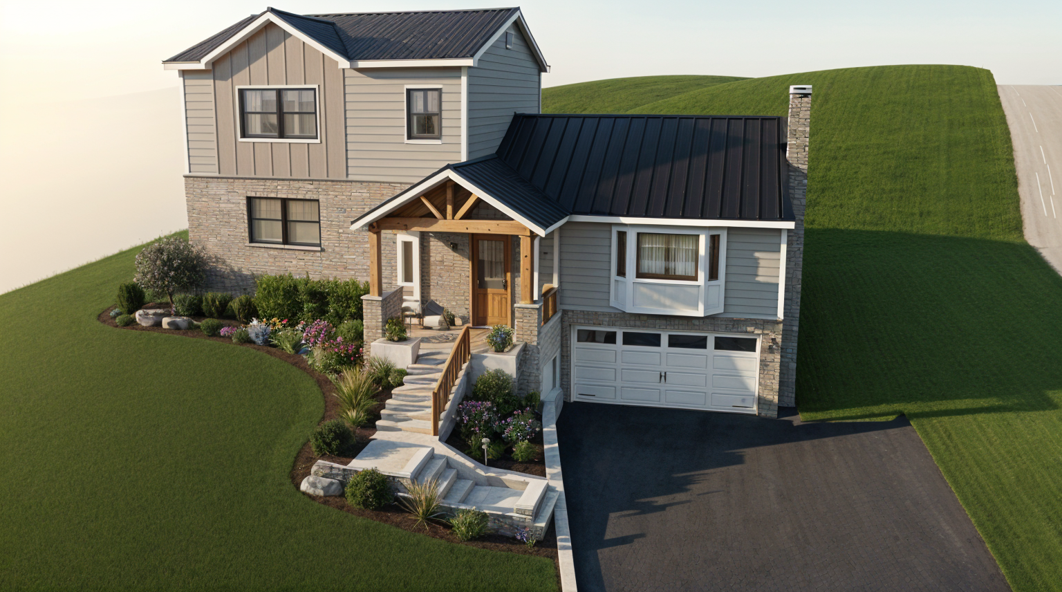 render a modern two story house with a flat roof the upper section features rich wooden panels in a warm walnut brown the lower section is adorned with sleek gray stone in a polished slate color accented with white stacked stone pillars for contrast large windows creating an inviting ambiance the left hand side of the house features a deep covered porch create an elegant patio with a fire pit in the middle and set the scene under a clear blue sky giving a fresh and peaceful atmosphere