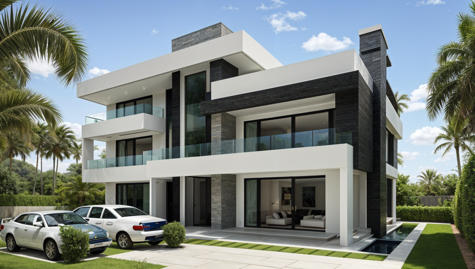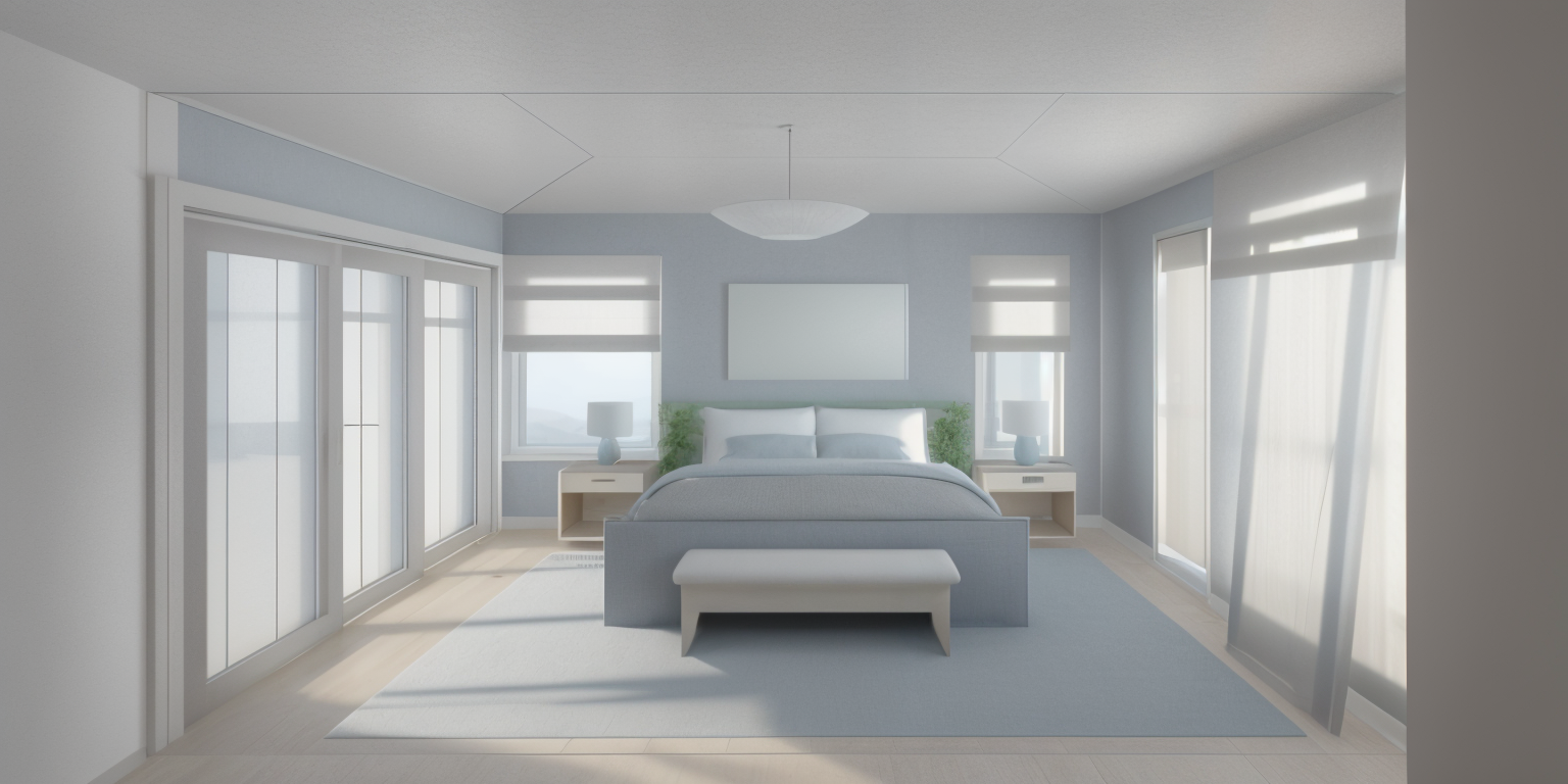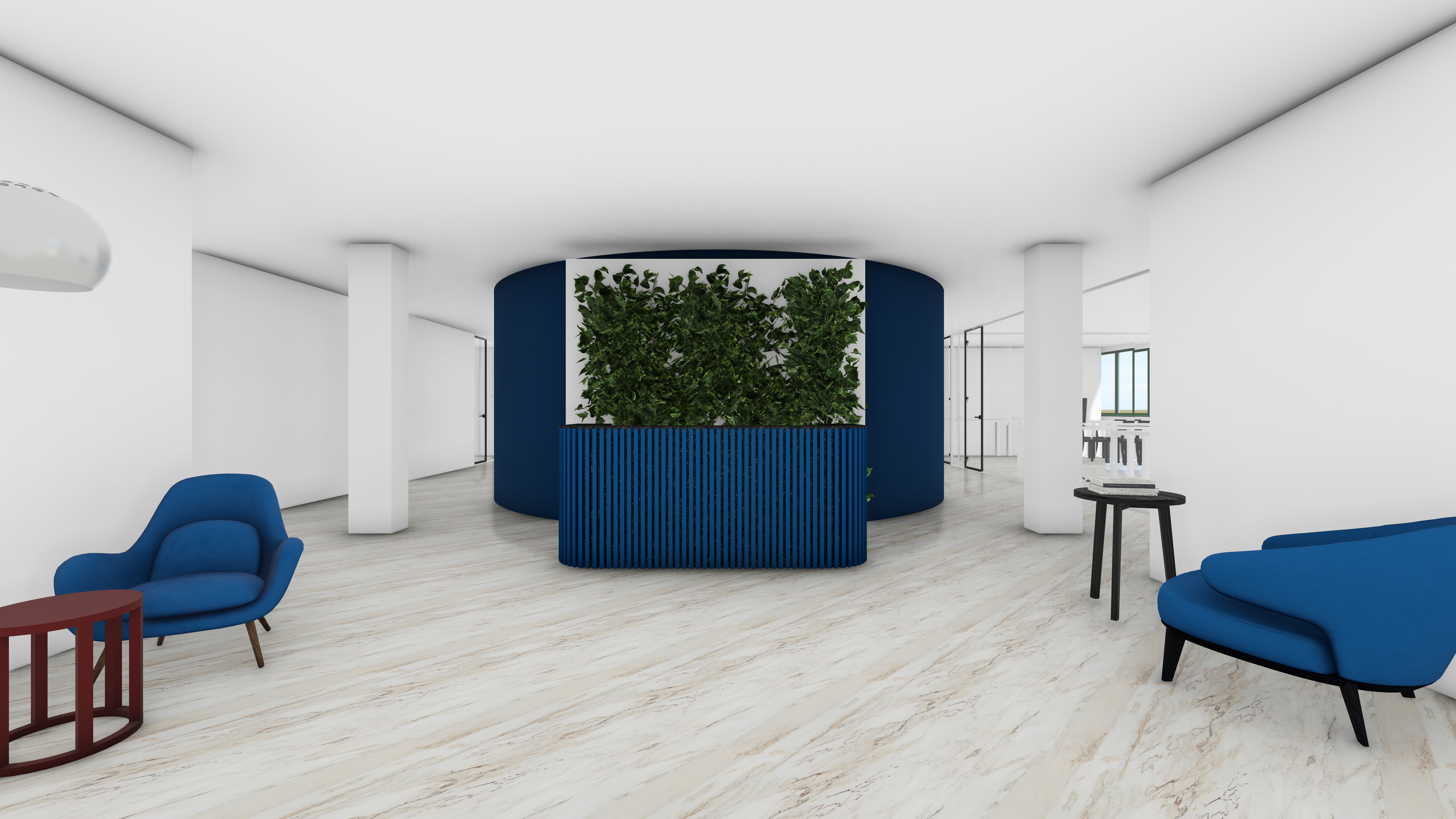 interior shot modern interior design spacious open floor plan bright minimalist style with white walls and light wood floors bold blue curved wall with lush green vertical garden mid century modern blue chairs light flooding through large windows cozy atmosphere contrasting deep red side table for a pop of color sleek black round end tables warm and inviting ambiance