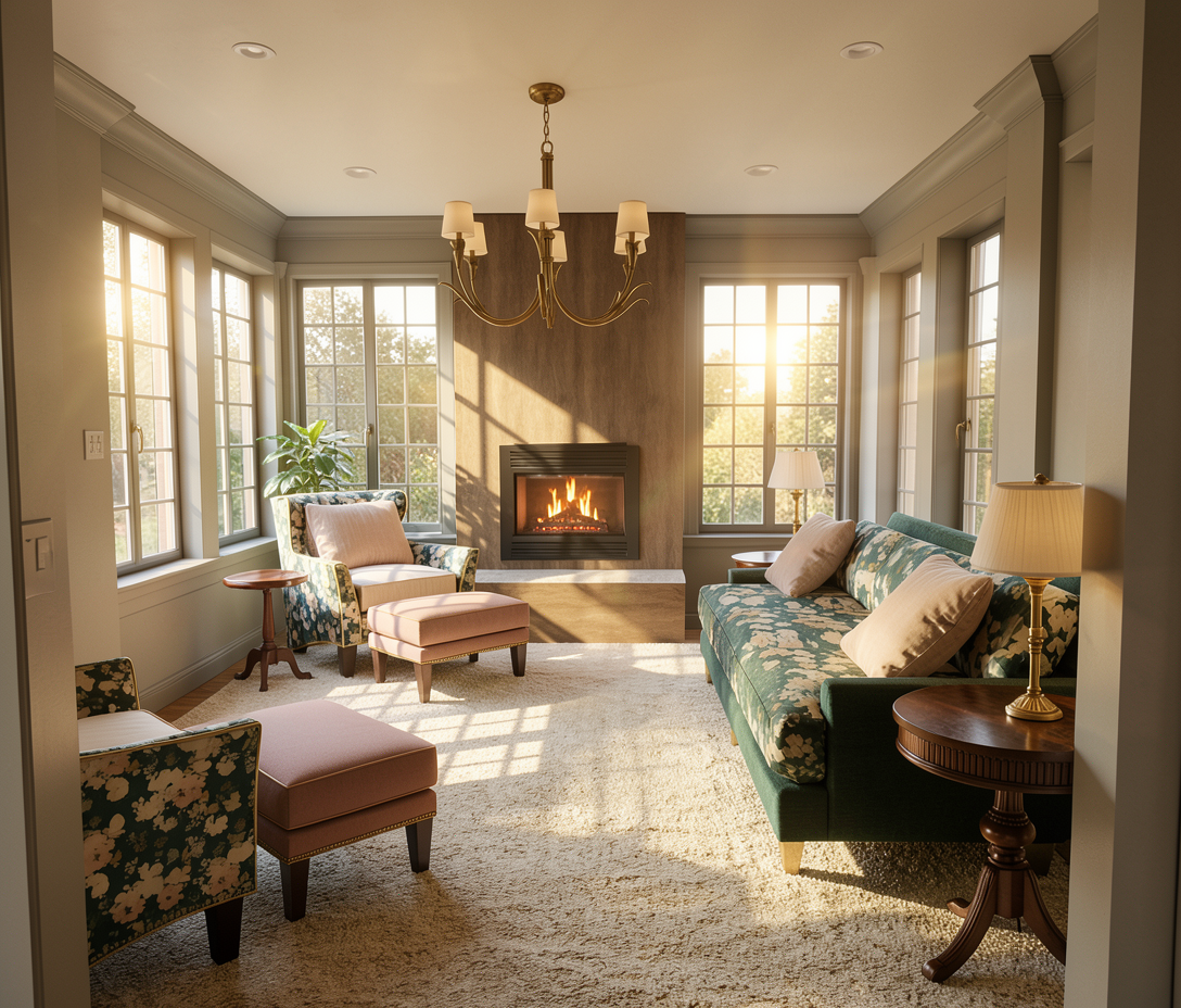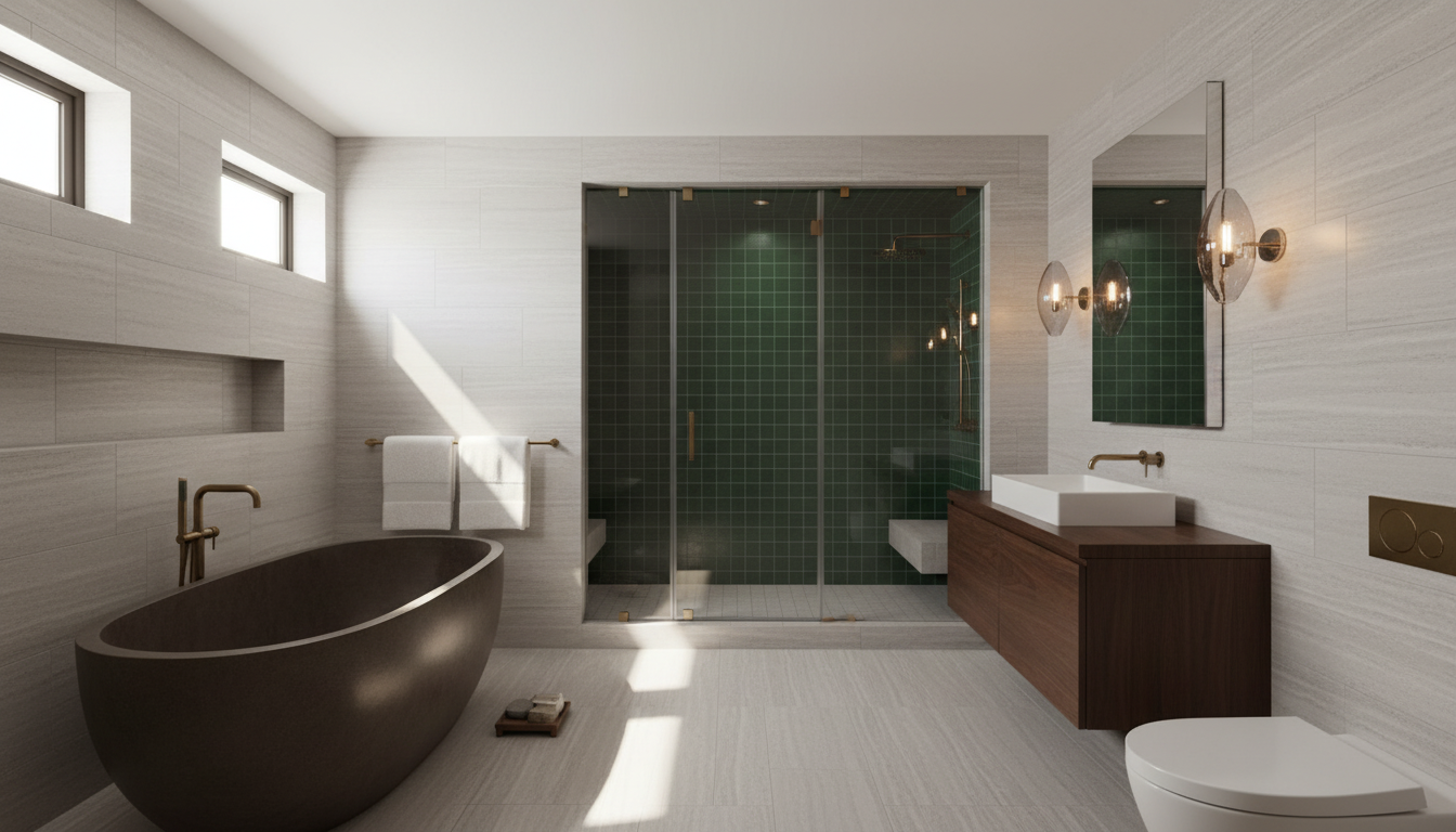 create a serene and luxurious bathroom scene based on the given layout the room dimensions are approximately 6 x 11 design a modern japanese scandinavian bathroom from the pov of the entry on the right is the toilet followed by a minimalist walnut wood floating vanity with a sink sunk into it on either side of the mirror and handblown glass light fixtures in front of the viewer on the back wall is a fully enclosed shower area a dark green tiled spa steam shower the doors to the shower slide and seal to hold in steam on the left opposite the vanity include a dark brown stone freestanding oval bathtub on the left that sits directly on the floor include two small windows on the left above the tub that allow direct sunlight in use a color palette of neutral tones charcoal wood stone for a zen calming effect with matte brass fixtures the atmosphere should be peaceful and spa like inviting relaxation and tranquility no plants