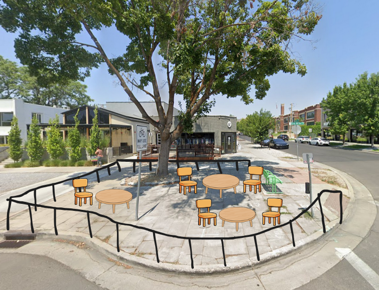 make this area a public outdoor seating arena with modular furniture in an architectural futuristic style