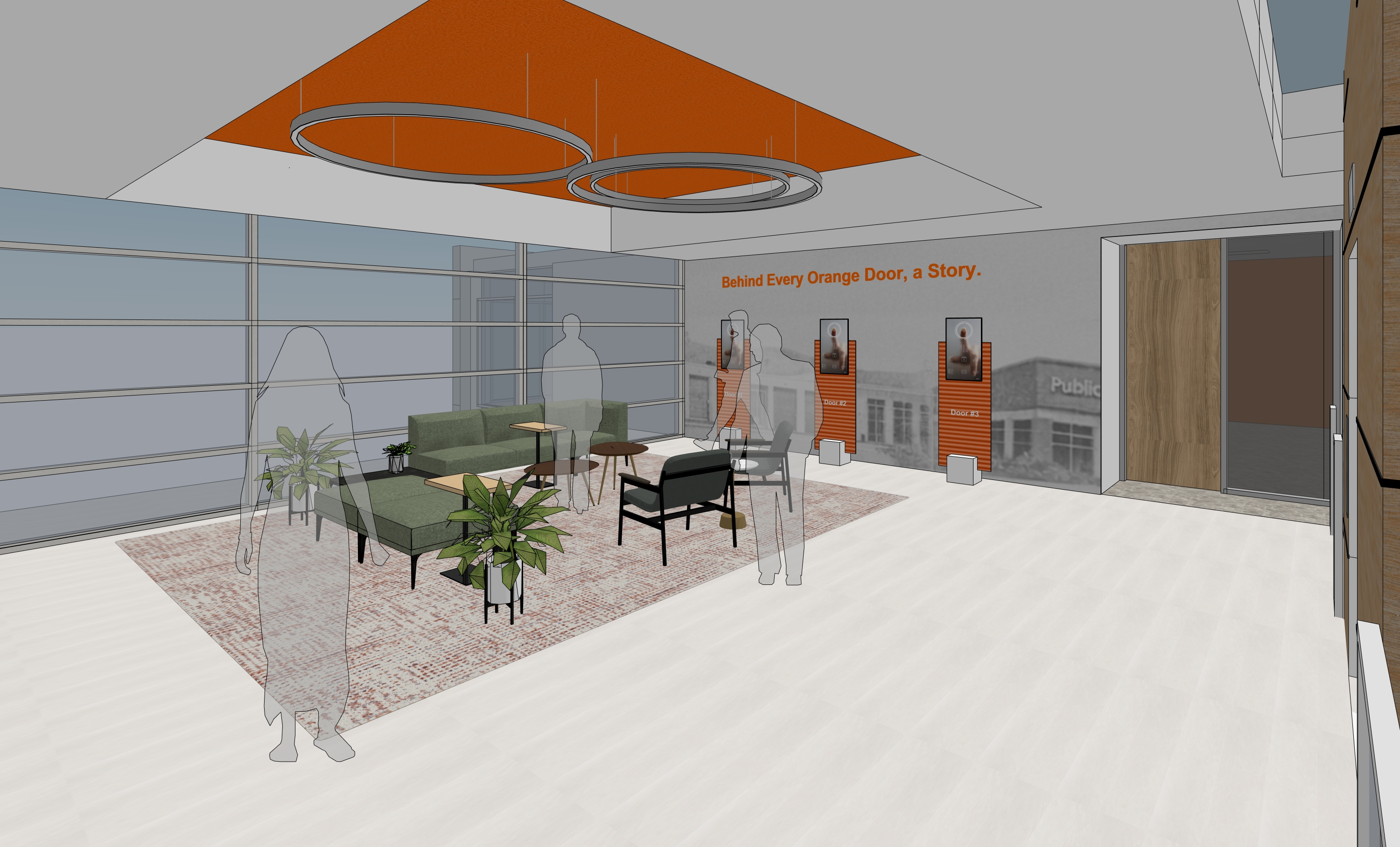 photorealistic interior polished tile floors white walls and light metal orange finishes the space is lit up with soft ceiling soft circular lights orange felt panel in the center of the ceiling individual tv displays on the back wall bright lighting and overall environment is soft bright lighting view outside of clear glass of second story above looking down at parking lot one story below with trees in the afternoon