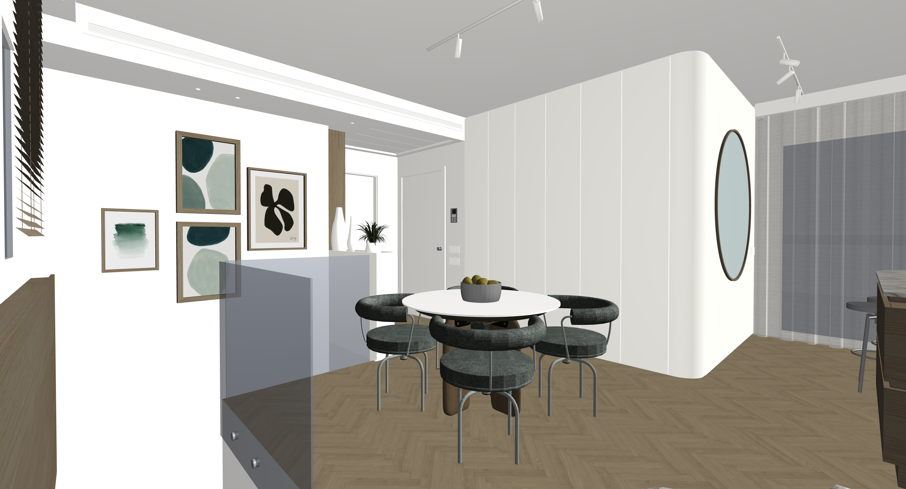 zona giorno con mobili in bianco caldo e in legno rovere naturale le pareti sono tinteggiate di bianco a soffitto abbiamo un binario bianco con faretti bianchi accesi con luce calda sopra la tavolo e uno sopra allo specchio tondo dietro al tavolo abbiamo un parapetto in vetro trasparente la boiserie in legno rovere naturale sulla sinistra ha una strip led incassata nella parte superiore che emette luce verso l alto sopra ai quadri ci sono dei faretti incassati lo specchio tondo ha una cornice in ottone sottile e riflette una portafinestra con tenda leggera metti una strip led nella veletta in cartongesso sopra alla tenda in tessuto leggero fai entrare un p di luce naturale dalla portafinestra fai entrare della luce naturale anche alle spalle dell immagine metti qualche oggetto di una zona giorno