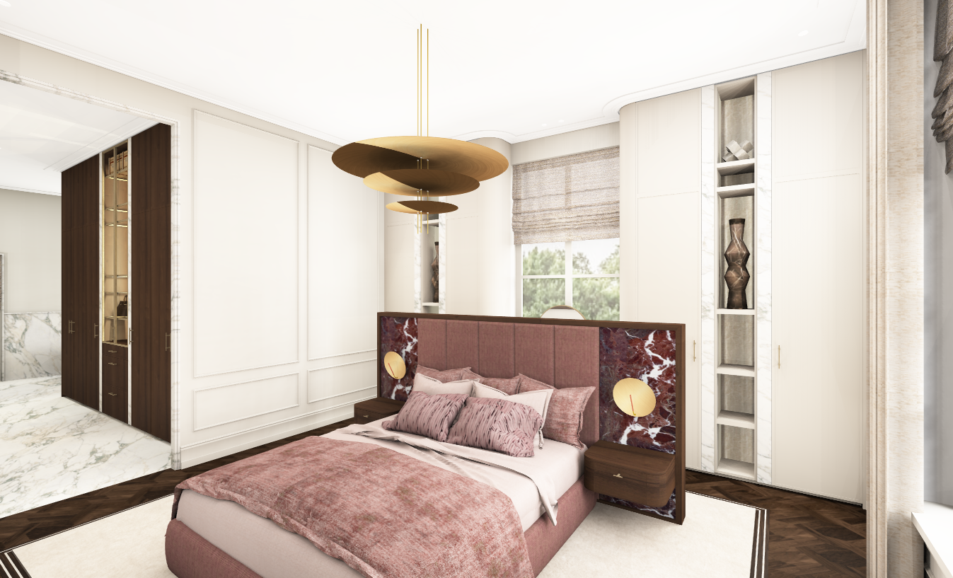transform this image into an ultra realistic 3d photorealistic render preserve the exact original perspective camera angle proportions composition and geometry without any distortion or changes use physically accurate materials pbr with clean flawless surfaces no dust no scratches no damage no imperfections apply natural lighting with global illumination soft shadows and ambient occlusion use a professional full frame camera look with accurate focal length and balanced exposure ensure sharp high resolution output 8k quality with realistic but clean reflections and smooth surfaces maintain true to life colors and contrast no stylization no artistic interpretation strictly clean pristine photorealism the lighting on the ceiling and beside the bed is from catellani smith please add lighting to this and add vertical lighting in the niches