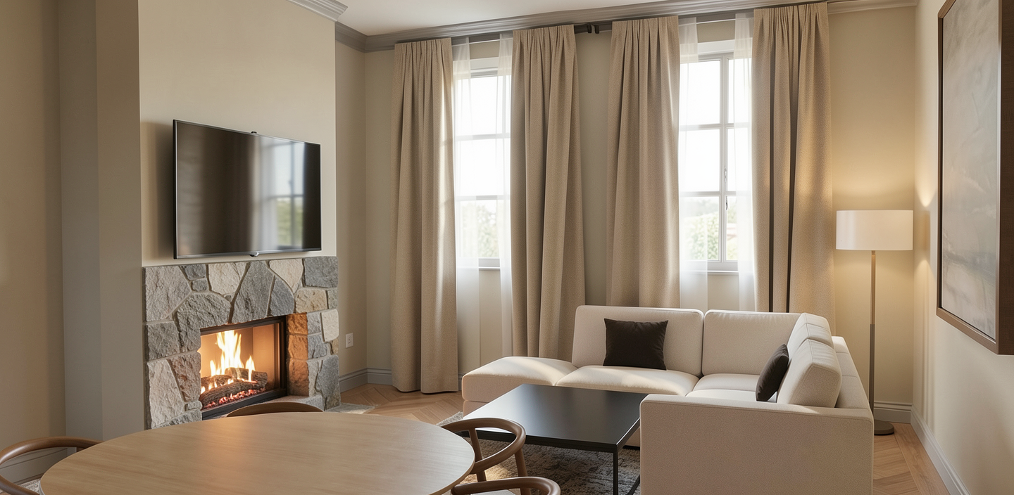 keep architectural and structural details no changes to the design green lawn in foreground cars and a yellow tow truck in front of building in centre buildings are white