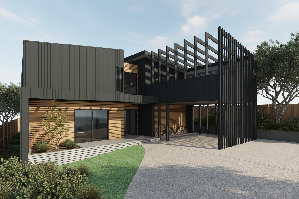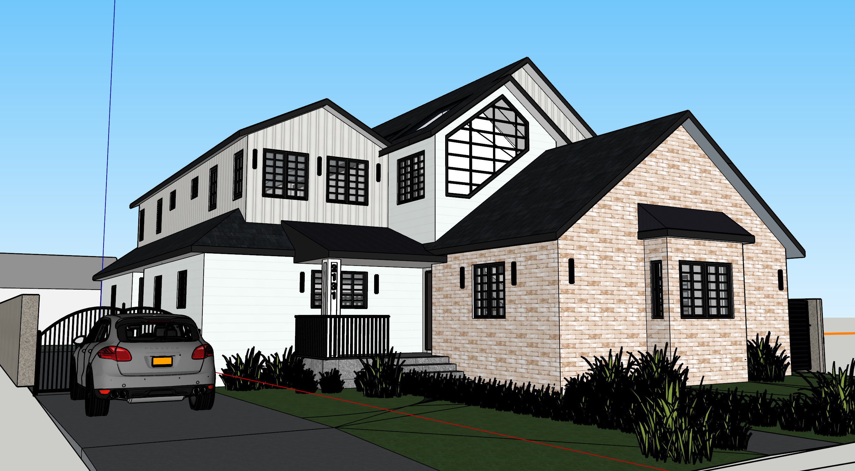 white wood siding front light brick veneer black window frames