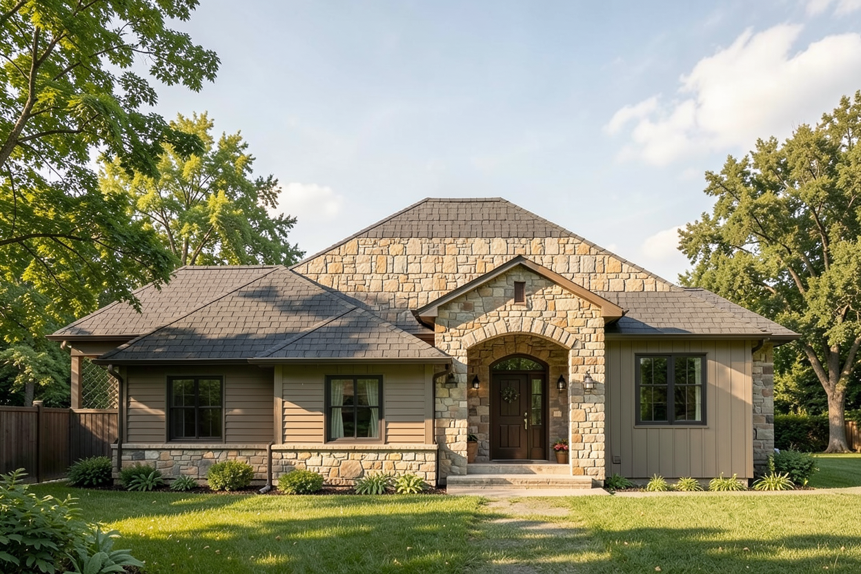 photorealistic interior kitchen render maintain the exact layout proportions and colors from the model dark ink wood shaker cabinets maintain the same color as the image shown with wood graining going through with warm brass hardware large island with rich medium caramel stained wood panels and the same wood medium caramel stained countertop perimeter countertops are dark stone which is matte full height backsplash behind the range is a dark natural stone slab with subtle movement range hood is brushed aged copper metal slightly worn soft sheen not shiny upper soffit beam wrapping the room is warm natural wood with visible grain there are no lights in the beams they are a natural old looking beam open shelving on the left is wood to match beam the faucet is a matte black all exterior knobs and pulls on cabinets are brass wall sconces are warm brass with soft warm light doorway in the back wall is a pocket door opening no swing door visible lighting should be warm realistic residential lighting soft shadows natural reflections high realism do not change materials do not change colors do not redesign make it look like a real photographed kitchen cabinets are stained wood not paint visible oak grain texture