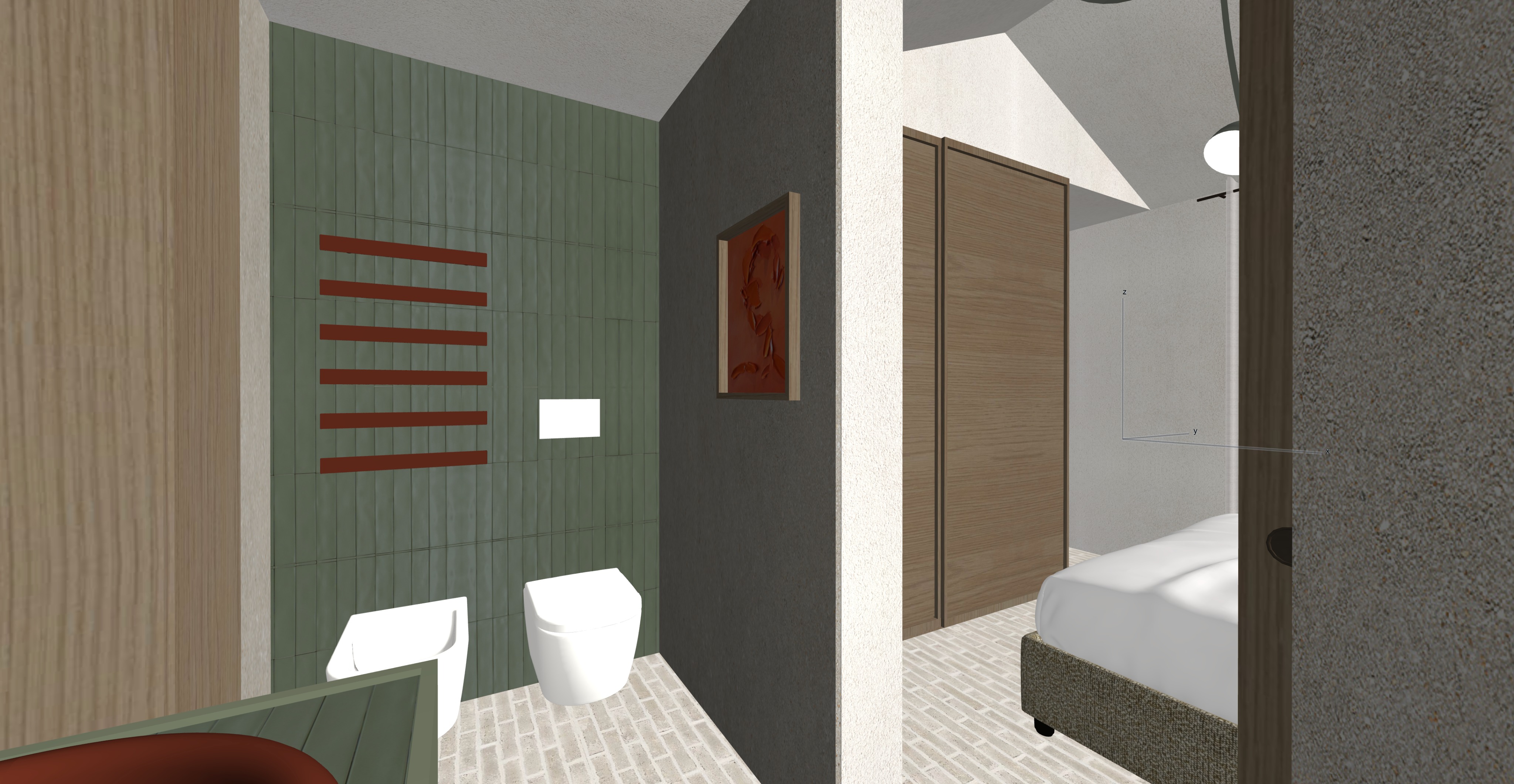 le pareti sono intonacate bianco caldo intonaco con texture come muri esterni ceramica lavabo rosso ruggine scura lucida mantieni texture immagine a pavimento mobile lavabo laccato verde salvia i sanitari sono bianchi lucidi le piastrelle sono verde salvia opache come il piano lavabo mantieni colore fasce orizzontali rosso ruggine opachi