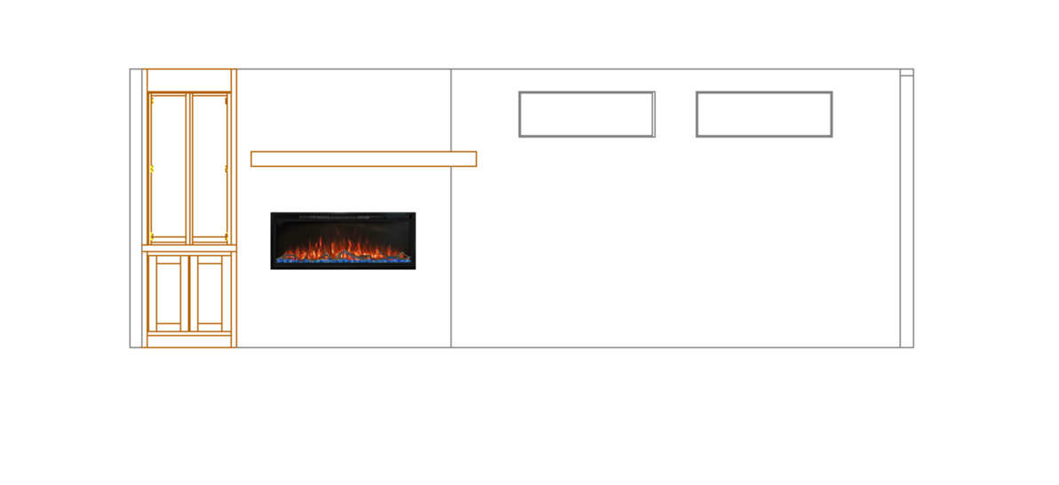 interior shot dark grey cabinets and mantle liner fireplace white painted walls white countertop and backsplash