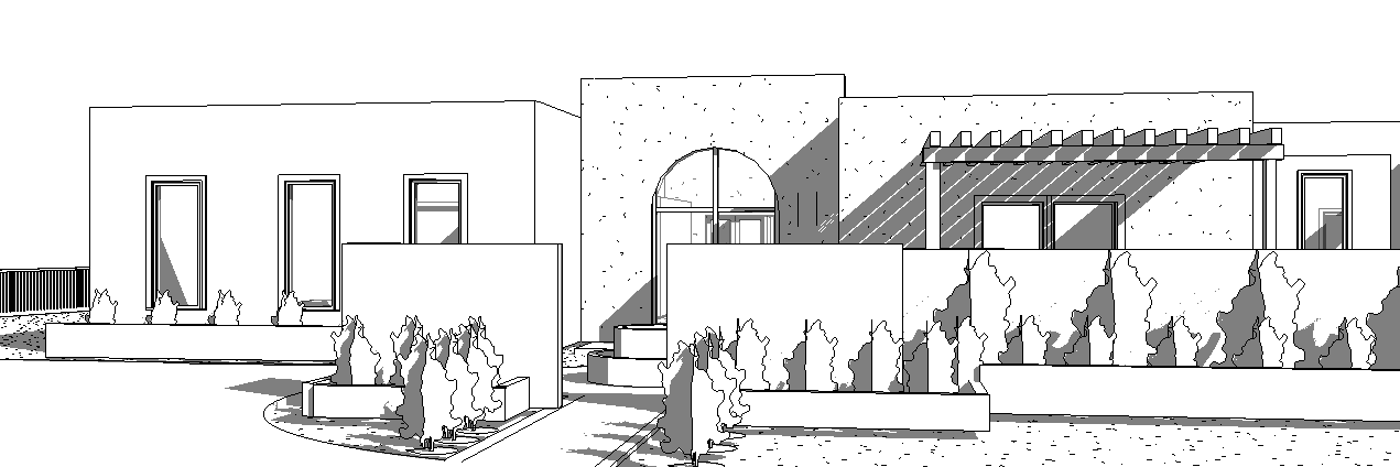 modern spanish style with white stucco black windows and doors add a small amount pink flower vines to the trellis only on the right side make landscaping modern and green