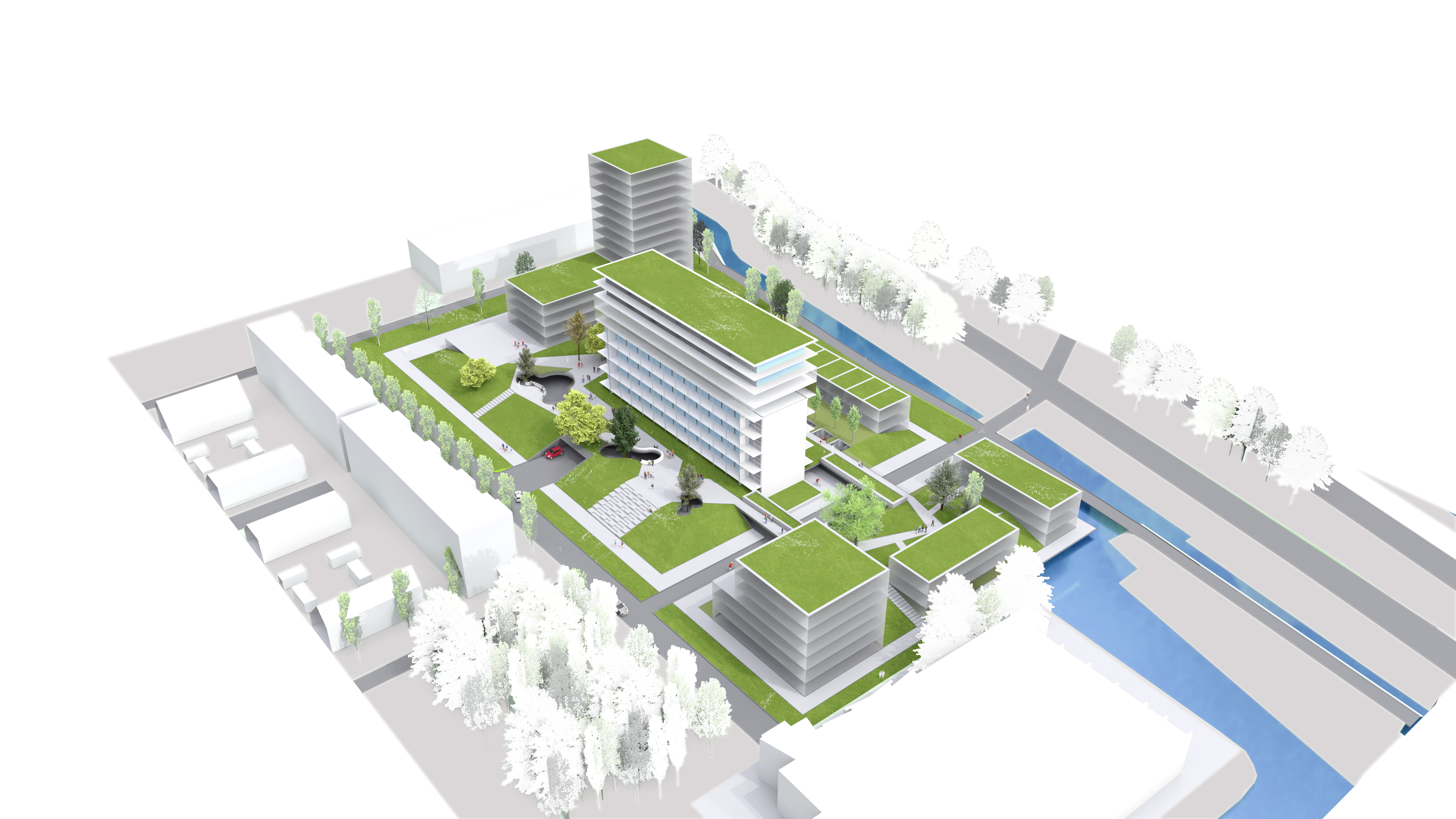 kan je deze birdview iets meer tot realistisch beeld verwerken verder geen aanpassingen aan het ontwerp groene daken graag en het deel eromheen wit laten architecture