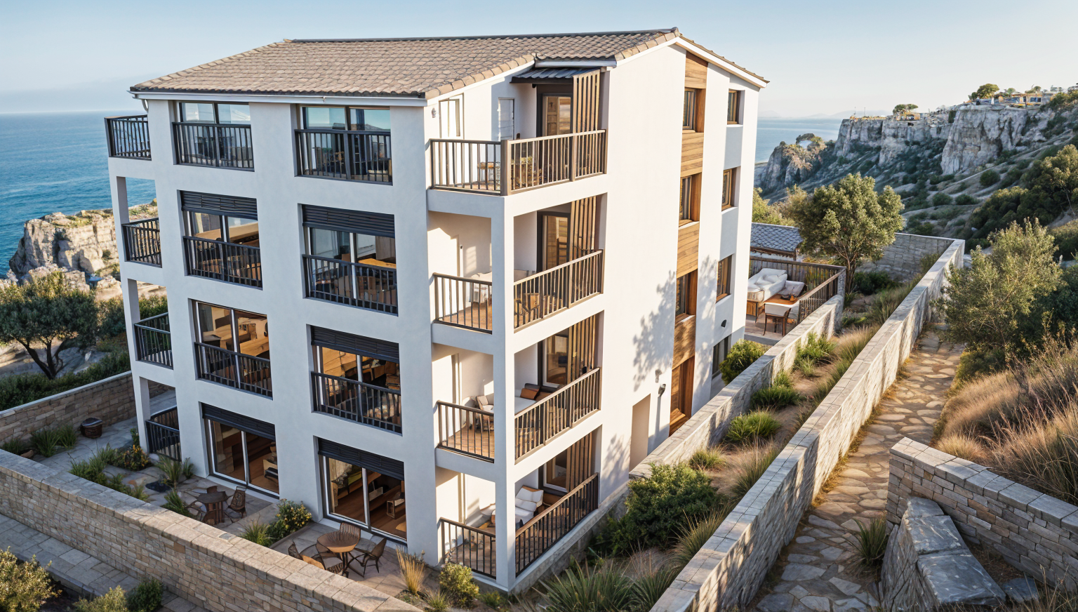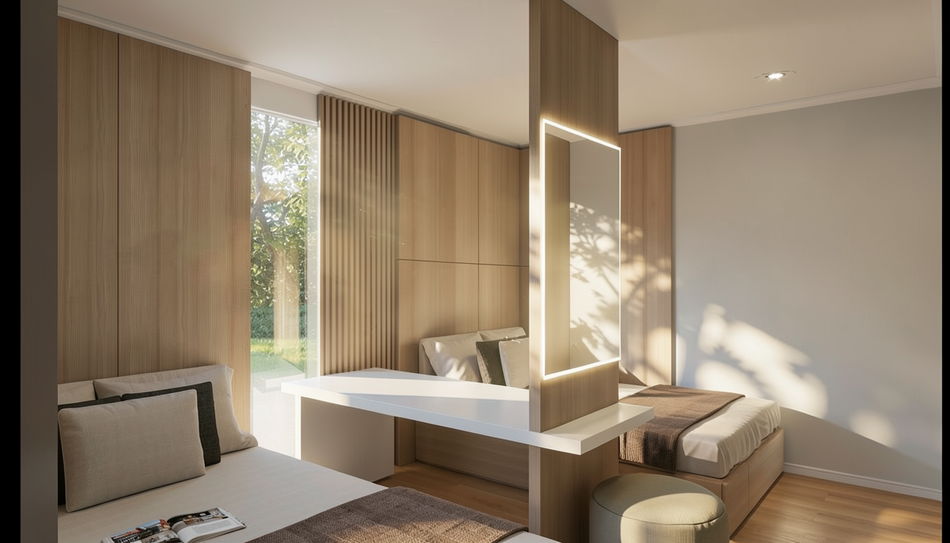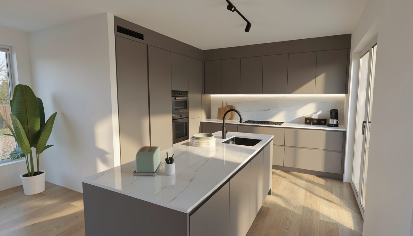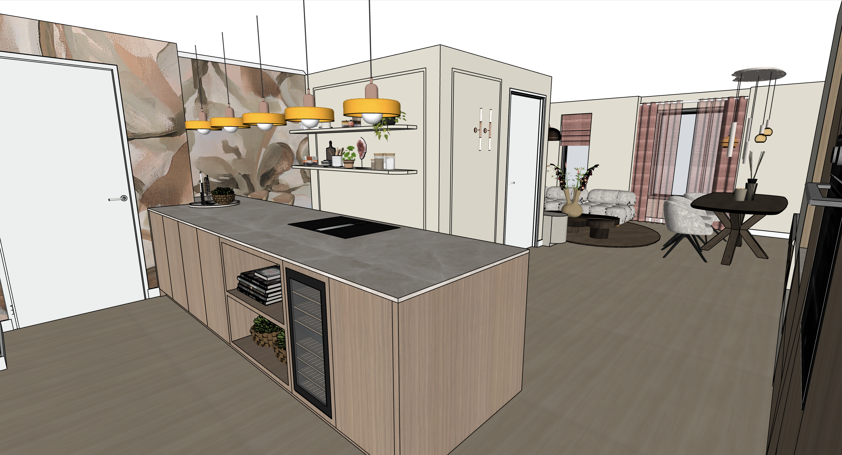 use soft daylight with warm sunlight tones subtle shadows realistic material textures and a cozy luxury atmosphere turn on the lights above the island