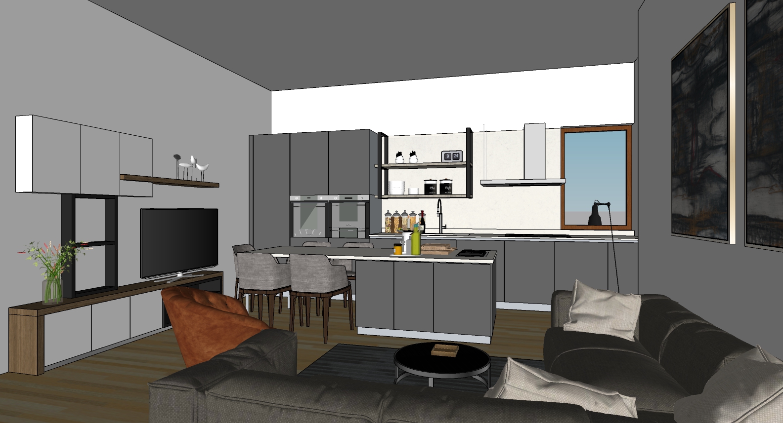 very bright modern and minimalist living area with elegant furnishings a flush fitting door white walls and a herringbone parquet floor a flat white false ceiling and abundant soft natural lighting create a relaxing atmosphere the geometry and materials remain unchanged