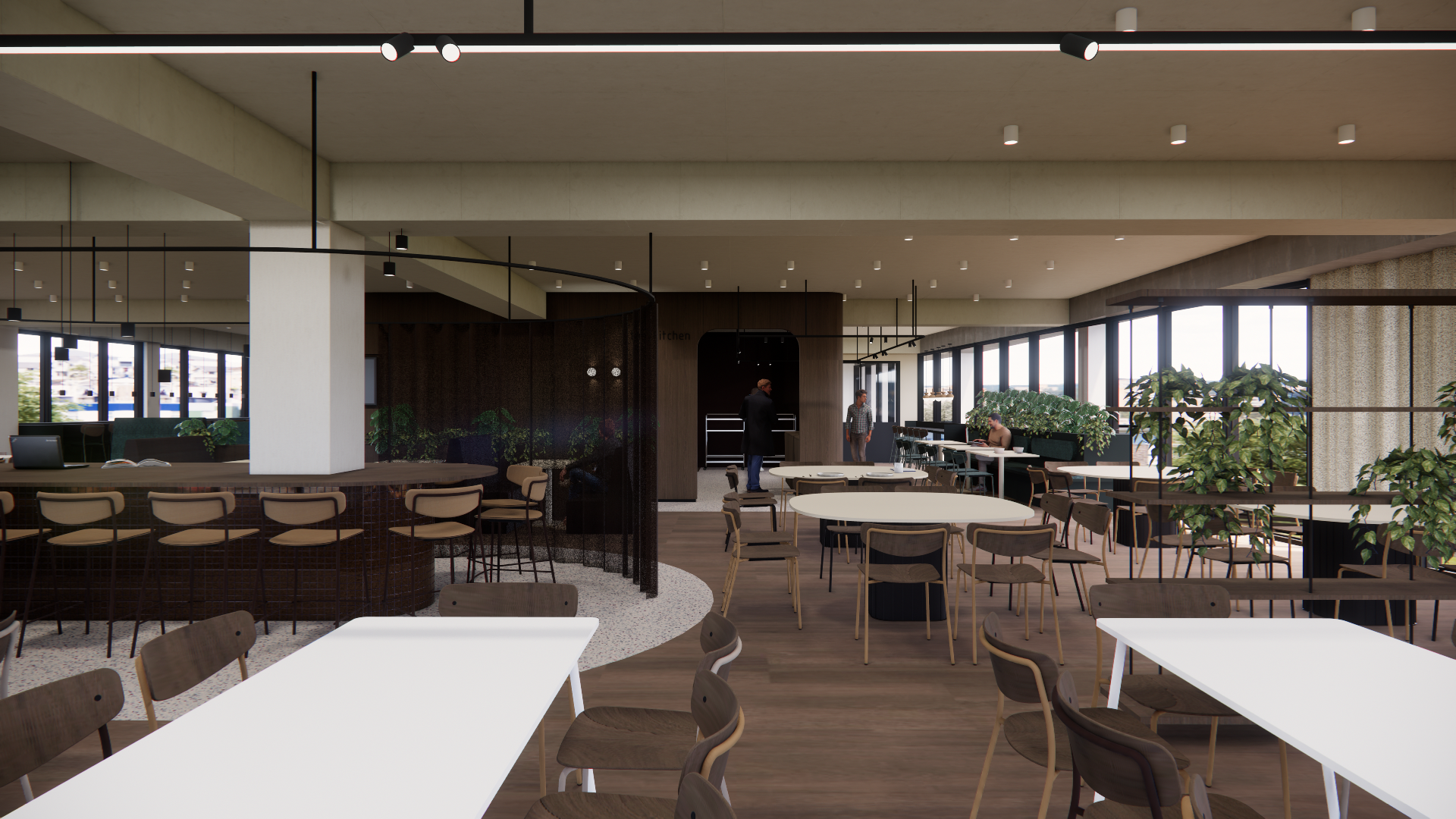 generate an image of a modern open space cafeteria with bright lighting featuring light beige acoustic structured ceilings include wooden floor with a natural mat oak finish design contemporary round tables in off white with stylish wooden chairs in a natural wood tone incorporate industrial style black light fixtures on the ceiling add large windows for natural light allowing a soft inviting ambiance the atmosphere should feel welcoming and vibrant