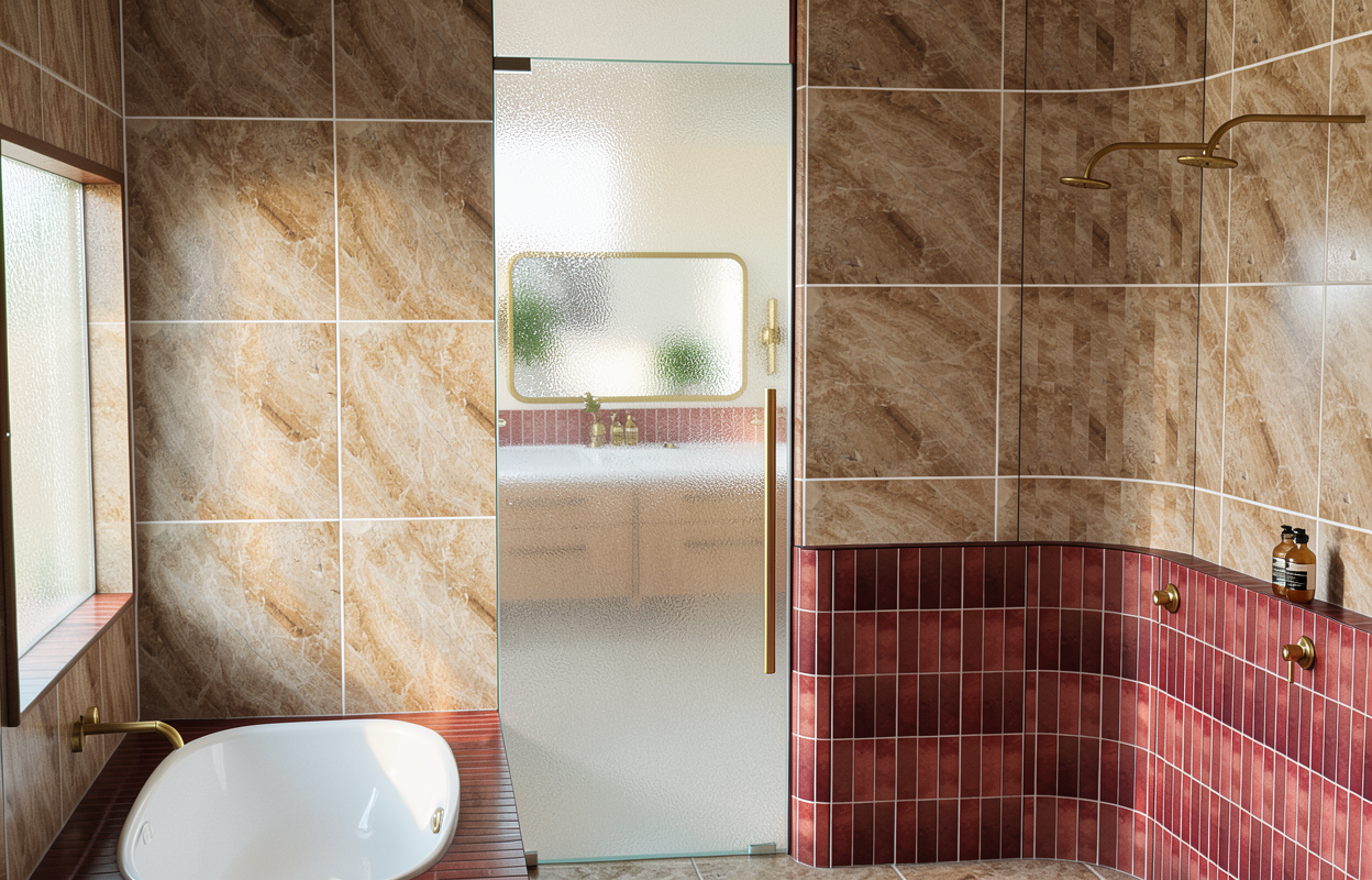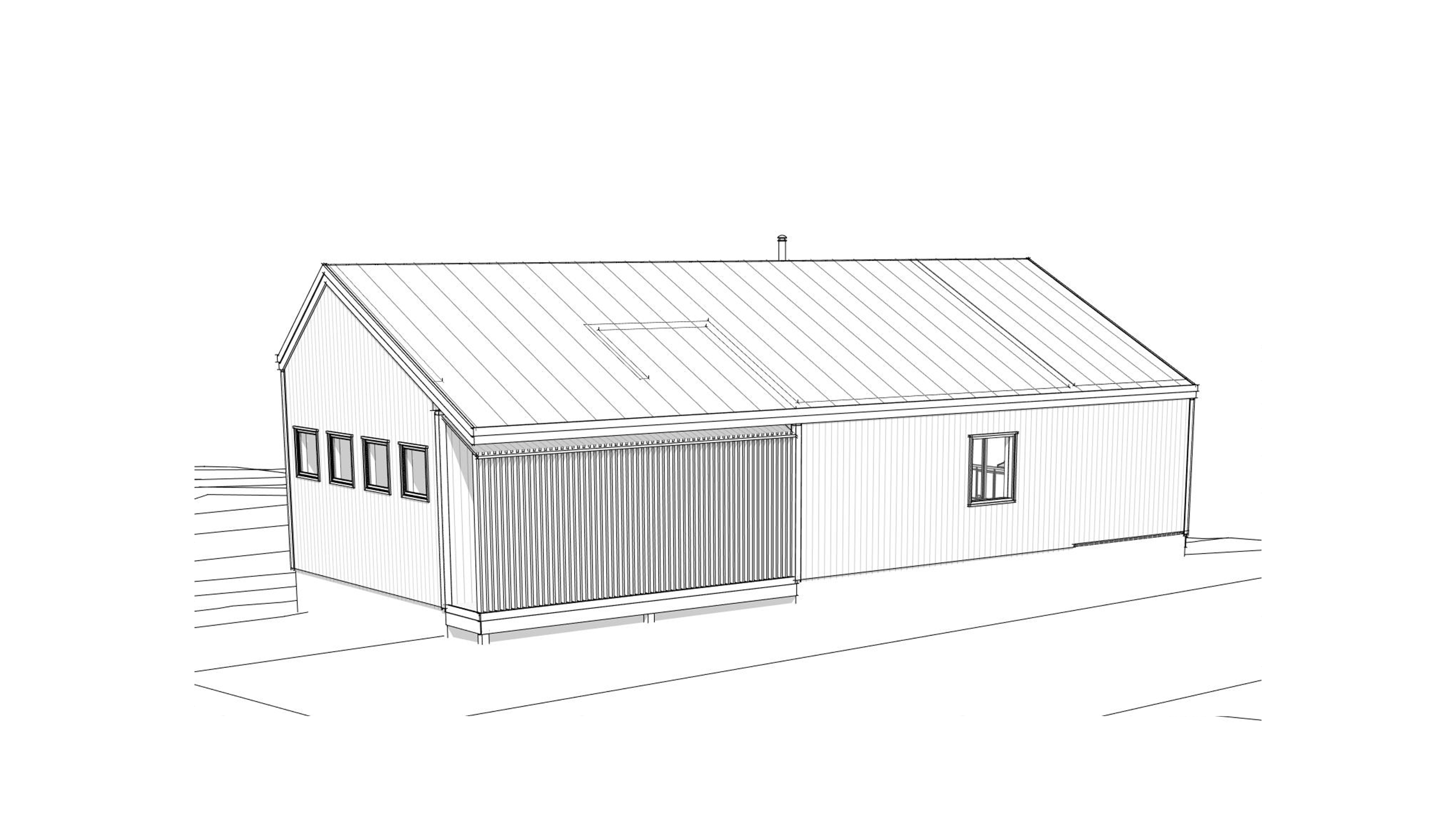 front view of a clean contemporary cabin architectural exterior home rendered in cinematic day time lighting with bits of blue skies and sunlight coming through the clouds cabin in a coastal setting with faint streaks of light coming through trees in the surrounding area warm glow and coastal reflections off of the windows blue sky with big billowy clouds rustic select grade vertical wood siding green manicured landscape around structure with gardens and patches of grass black standing seam metal roof prominent trees in the background high fidelity photorealistic visualization crisp shadow falloff refined facade geometry soft atmospheric depth premium architectural photography mood ultra clean composition and materials black window trim flat roof photorealistic render small concrete path around the exterior of the cabin hide concrete footings