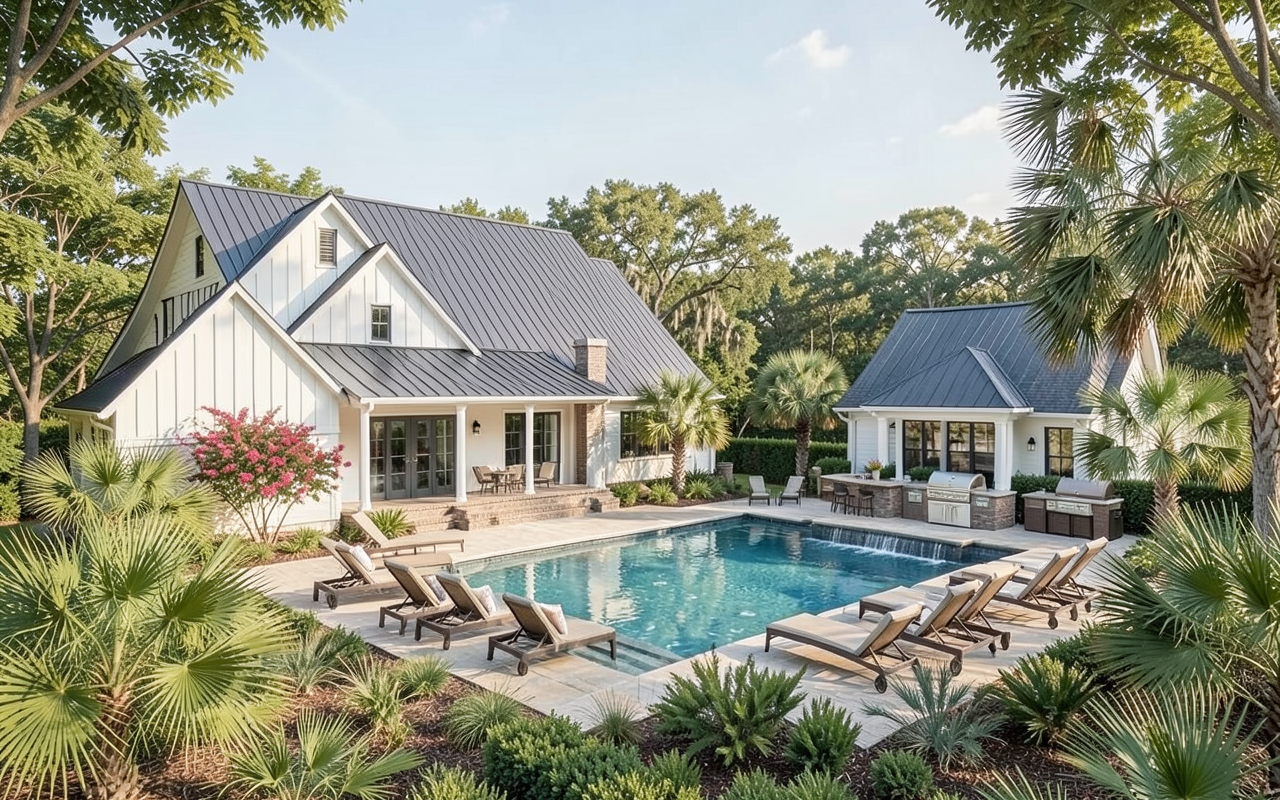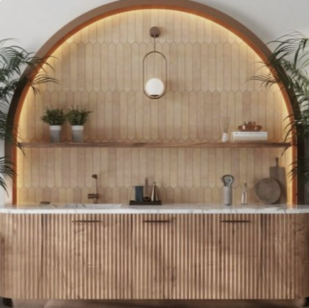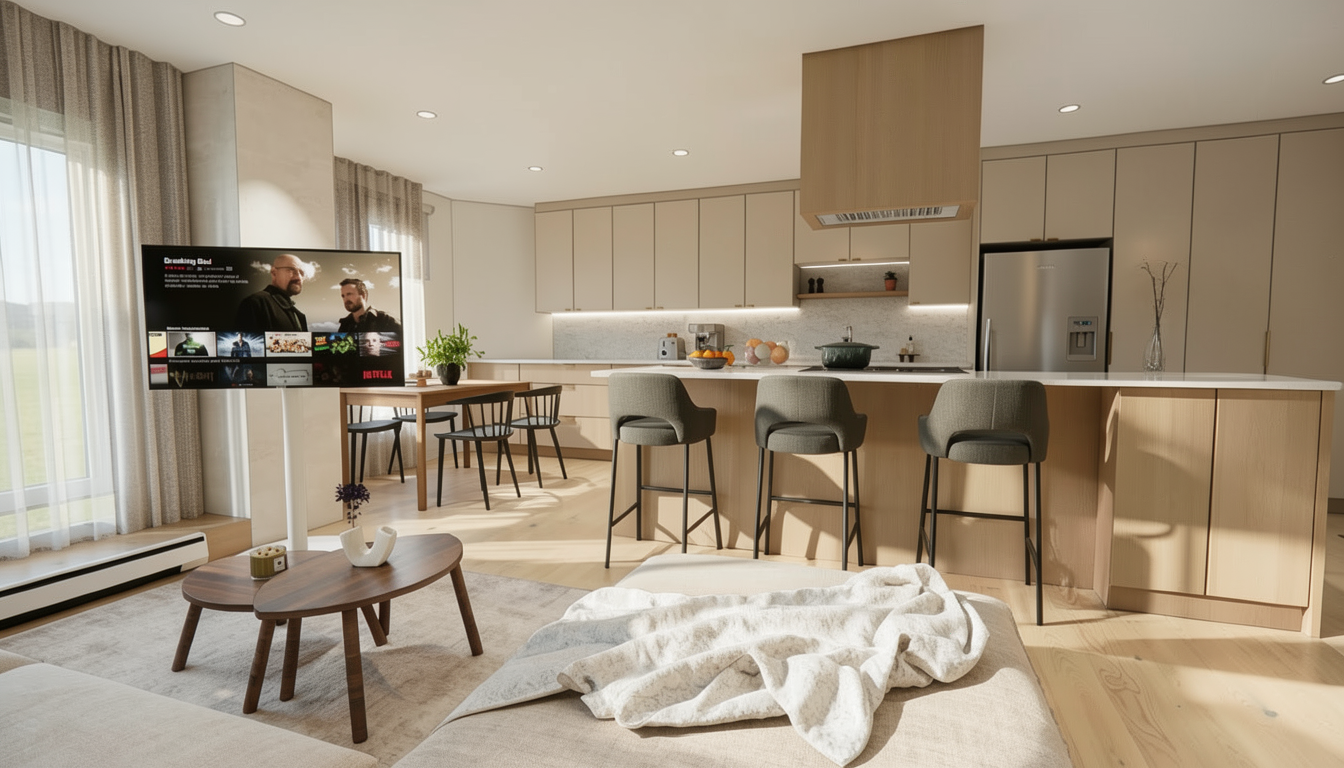 turn this photo into a 3d room with a large rectangle dining table in front with natural rattan chandelier and ceiling with a soffit and wood detail in the middle of ceiling