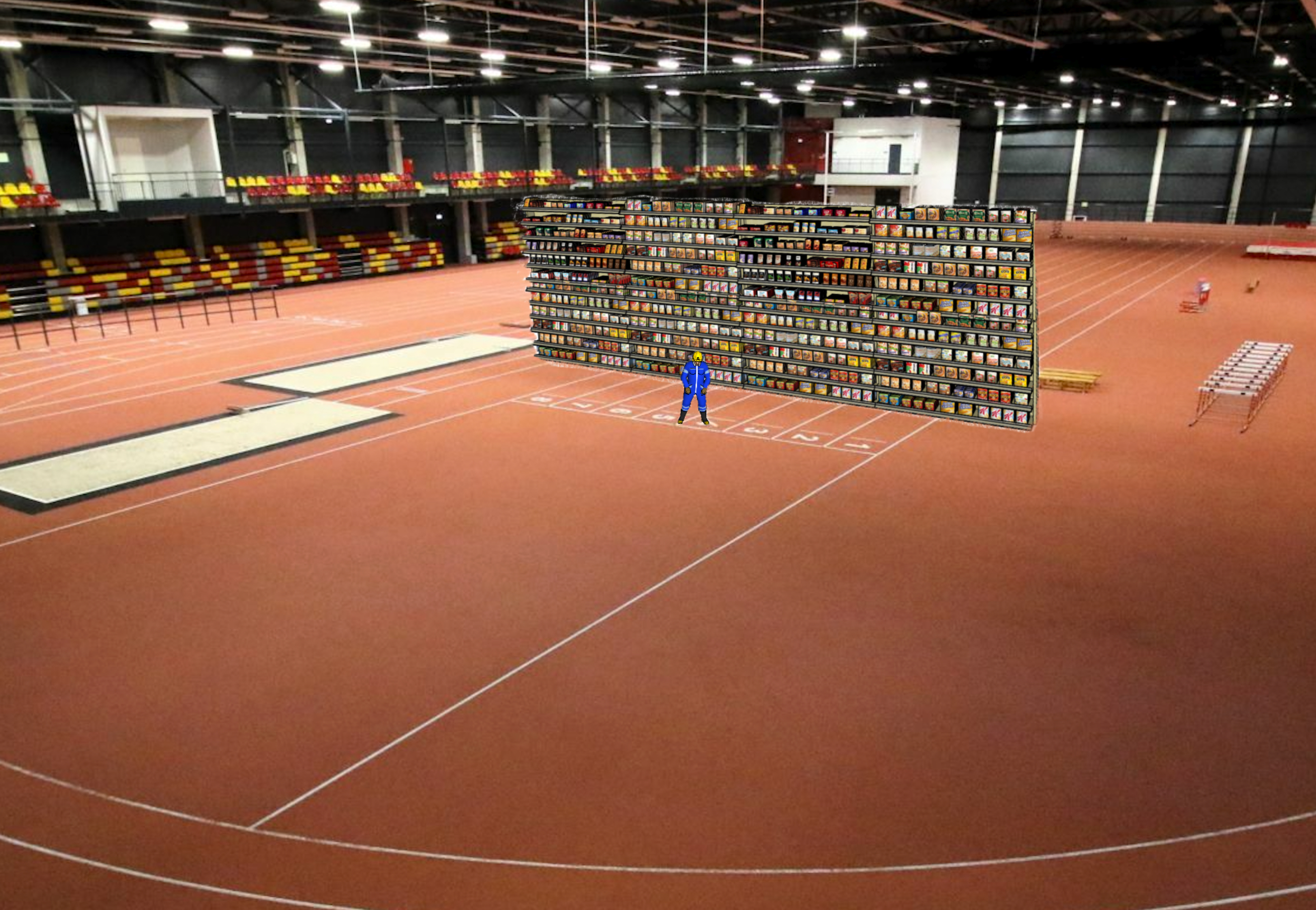 add dramatic light on the supermarket shelves in the middle of the stadium