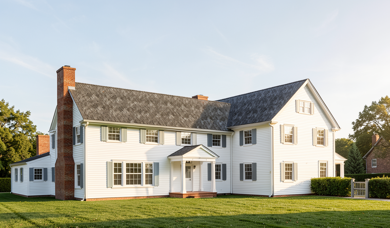 horizontal white siding white trim gray gutters