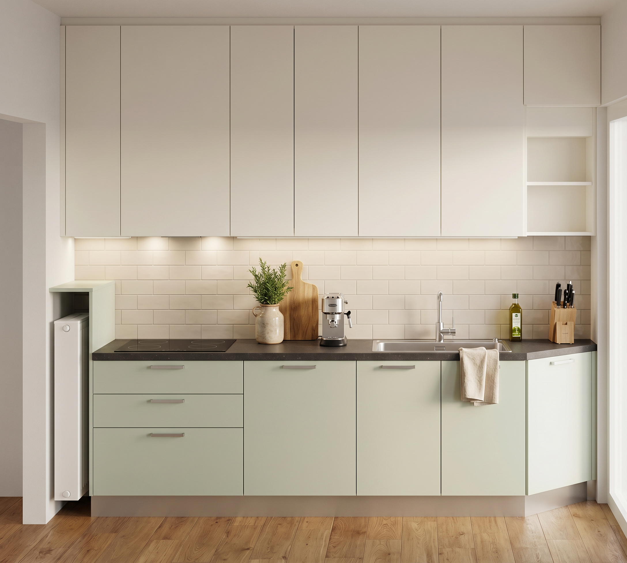 render a photorealistic modern kitchen interior with a cozy and inviting atmosphere features wooden cabinets in a dark gray with warm undertones with satin nickel cabinet hardware with a 3x12 artic white picket undulated tile backsplash with snow white grout and countertops highlight the sleek stainless appliances and countertop to be dawn mist granite stainless steel undermount double bowl sink with a delta westville single handle pull down kitchen faucet in artic stainless walls in a soft grey e0e2e0 ceiling in a white f7f7f1 base board in a white f7f7f1 show molding in a white f7f7f1 doors in a white f7f7f1 door hardware to be a satin nickel add floor elmwood smoke lvt in a soft cool gray brown cast and a more weathered look than the warmer oak visuals add three progress lighting cofield one light pendant with a slender design complements mid century modern transitional and contemporary settings with a simple round canopy suspended over a cylindrical glass shade over the island in matte black use a warm ambient lighting in the can lights show use a soft ambient lighting to enhance the warm atmosphere color scheme