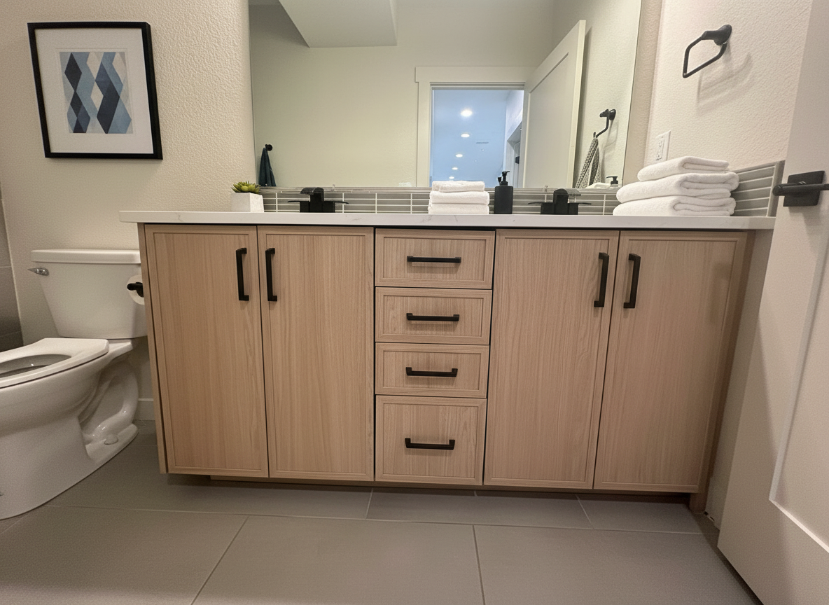 add natural lighting remove the glare on the tv remove all items on the countertop and shelves restage the countertop and shelves for a bar remove the glare from the lights clean up the floor