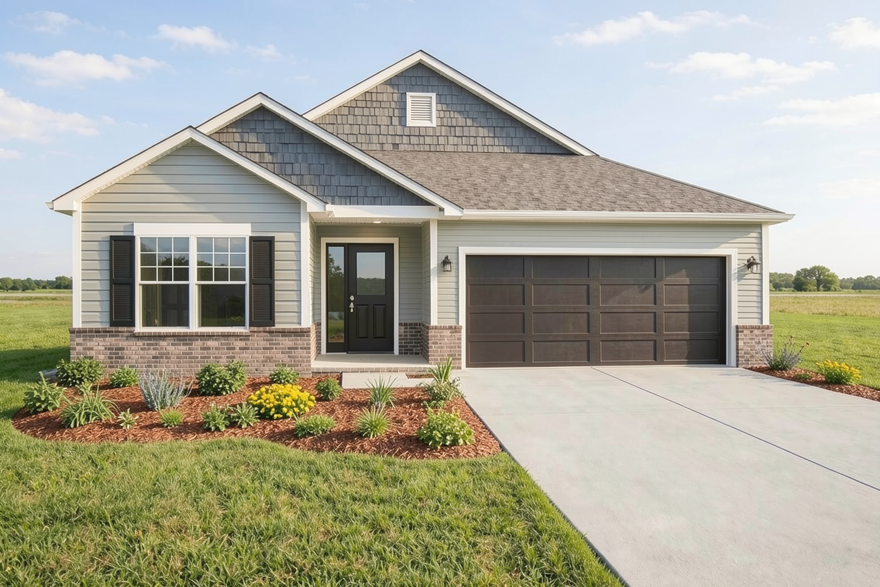 keep everything the same but change the mulch to brown change the siding to jameshardie arctic white change the shakes to iron gray change the garage door and the trim to black change the roof to black