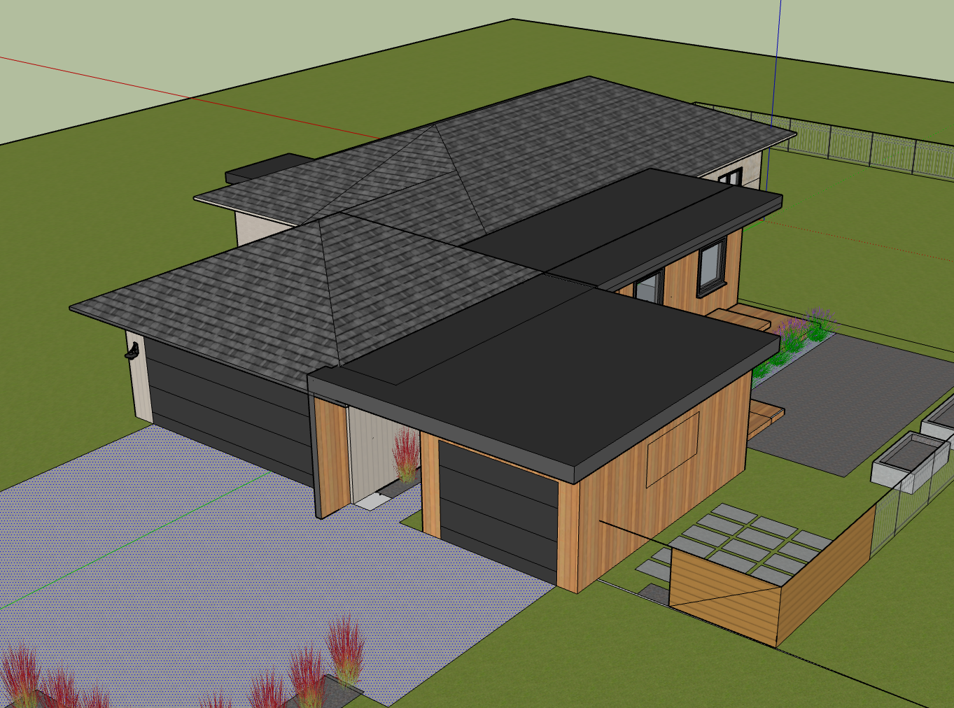 exterior shot a modern house with a sleek contemporary design the roof is a textured charcoal gray complementing the matte black walls the wooden accents are a rich cedar brown adding warmth and elegance the driveway is a light gray concrete bordered by vibrant red ornamental grasses adding contrast and color the garden features soft lavender flowers and lush green grass creating a serene and inviting atmosphere the scene is set under a clear blue sky with natural sunlight casting soft shadows enhancing the tranquil and modern feel