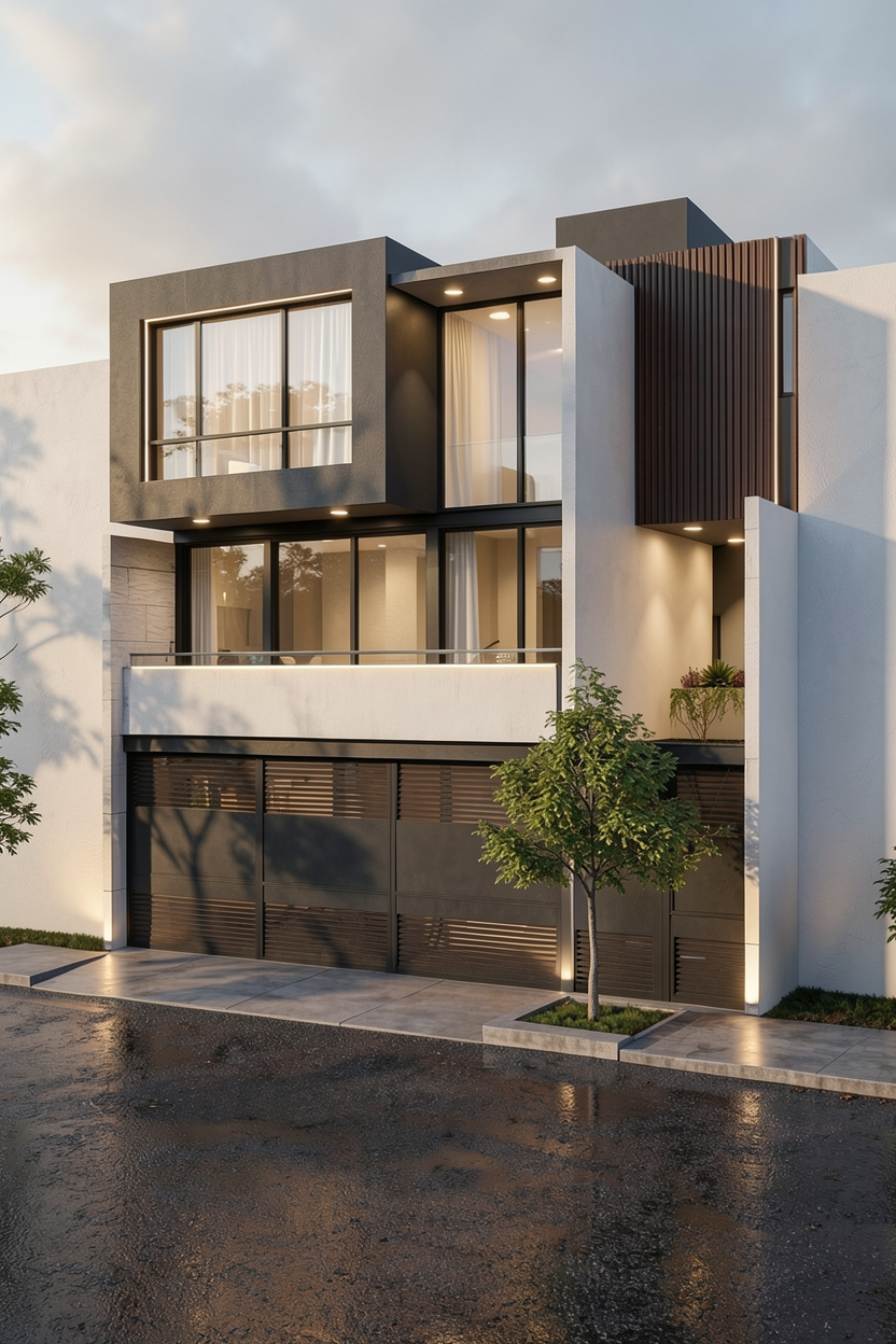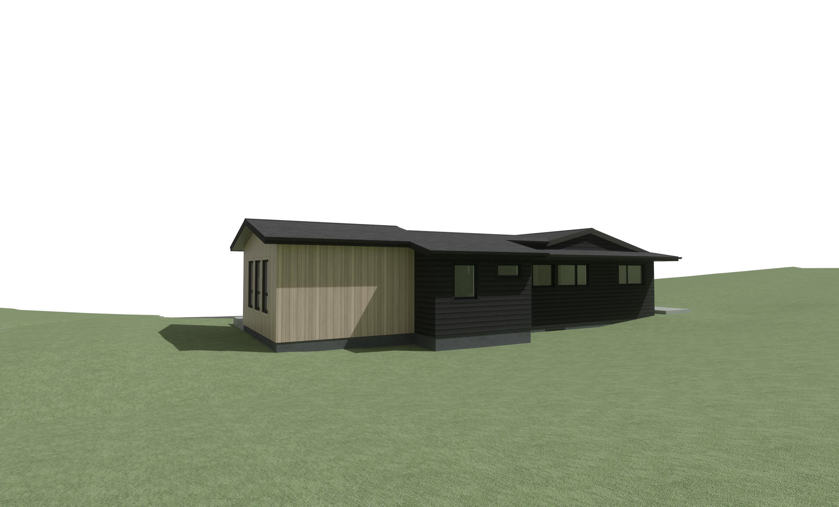 enhance the realism of the existing architectural design while maintaining the same materials and textures focus on realistic lighting shadows and surface details to create a lifelike appearance ensure the mixture of wood siding white siding and black sidng is preserved in the correct areas making them look authentic and cohesive this is in montana add montana landscape but nice landscaping near the house add montana vegetation around house make wood siding modern vertical 10 wider plank siding natural cedar light warm honey tone clear matte finish clean sharp edges minimal knots contemporary scandinavian farmhouse style high end residential exterior the siding is not board and batten it is wide planks with realistic wood grain texture do not change the driveway or the sidewalk all horizontal lap siding is charcoal black do not add sidewalk just do grass and landscaping in foreground make sure to keep the existing siding the same so dont change the black siding to wood etc all horizontal siding should be charcoal black