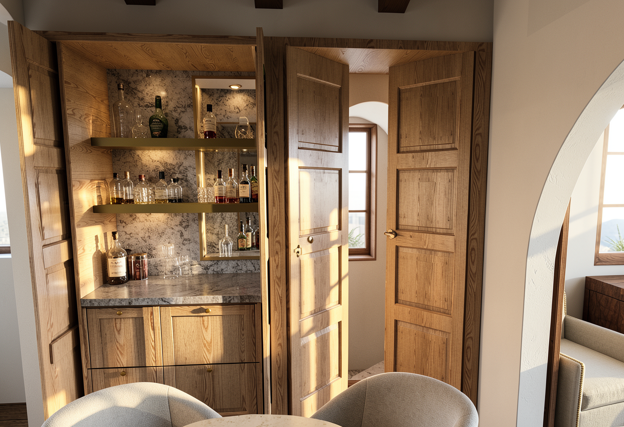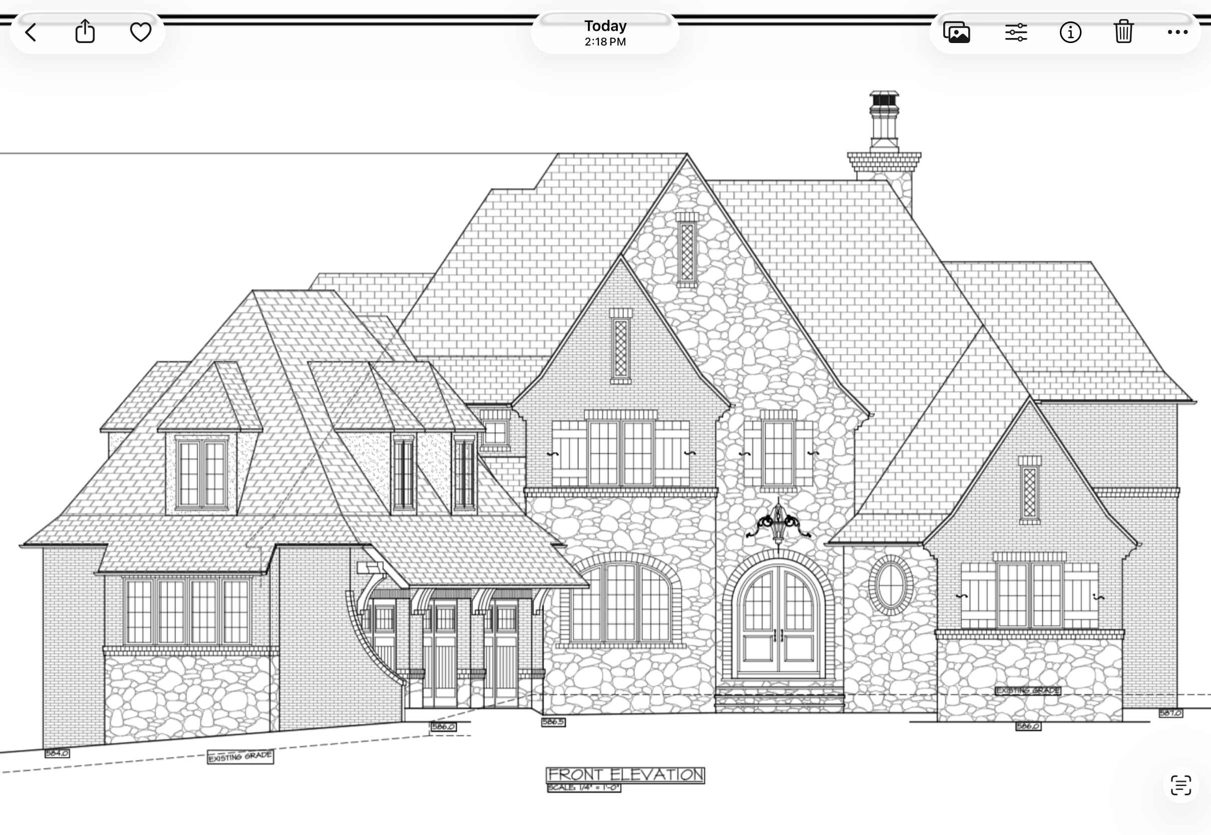 provide photo realistic rendering of english countyr style home light brick and varied mid light stone colors black roof windows and eaves keep all details as is lush landscaping and vibrant blue sky on horse farm