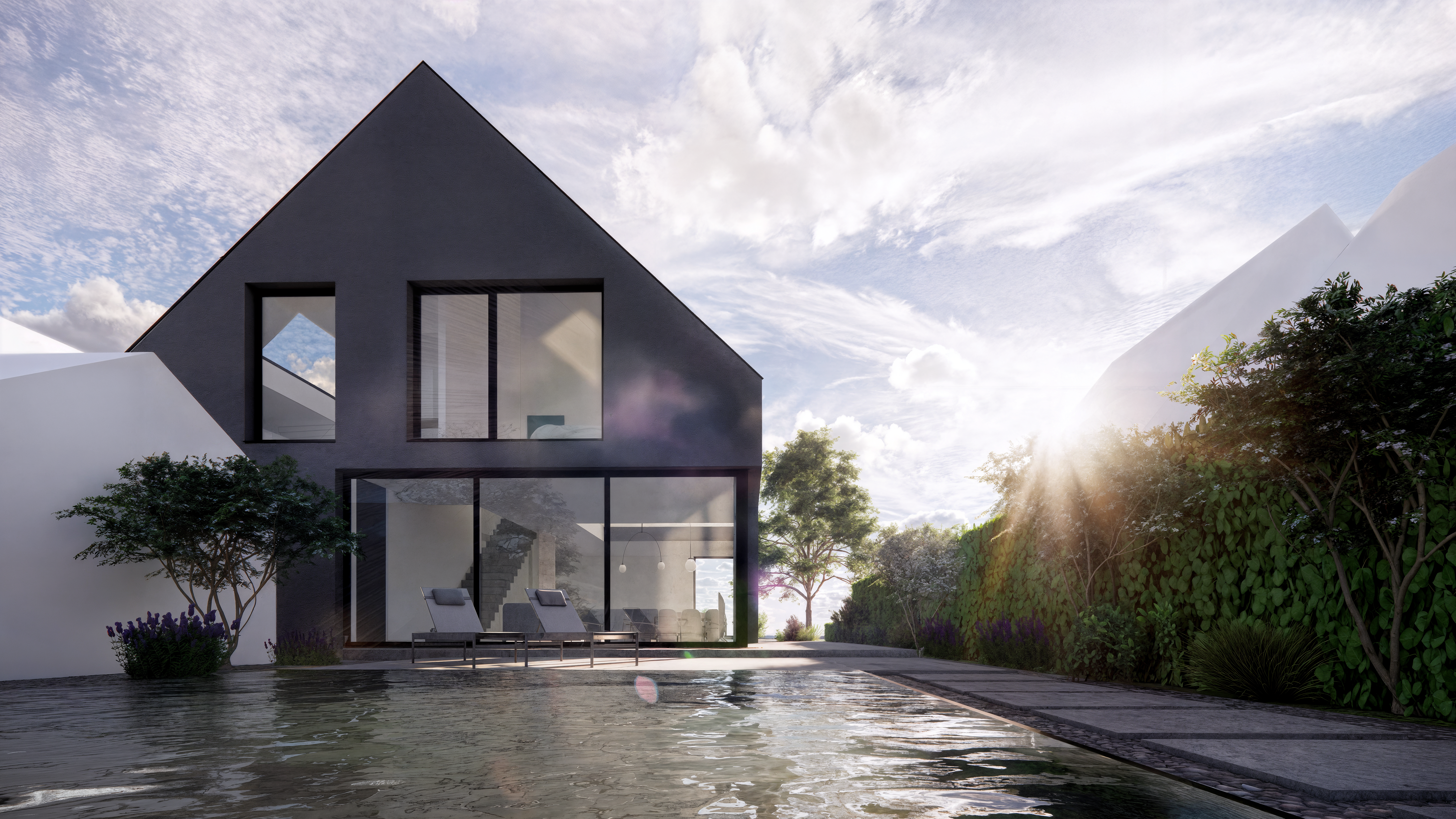 ultra clean white minimalist exterior with seamless surfaces monolithic volumes pure white plaster and a continuous jointless finish sharp precise edges minimal openings hidden details and a serene architectural purity bright sunlight soft shadows and an ultra modern gallery like presence pool architecture